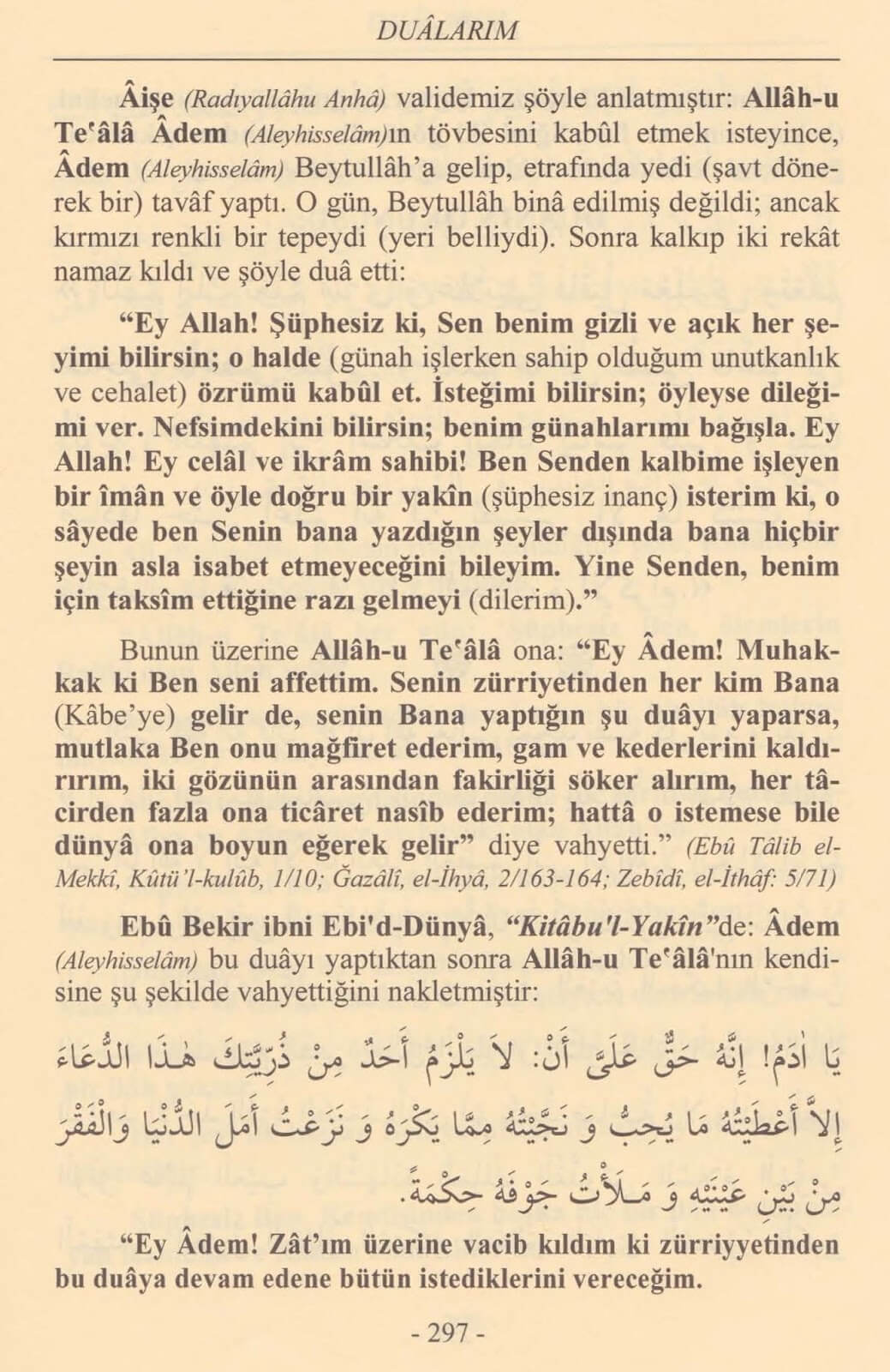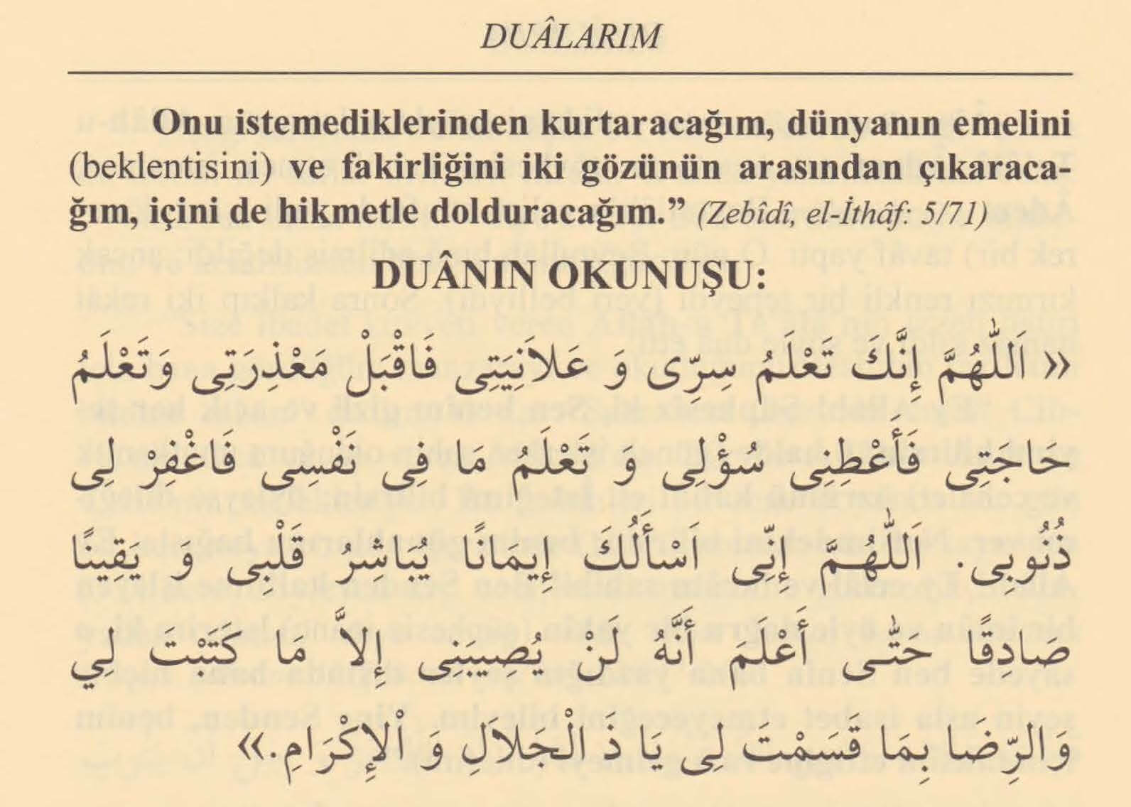 Allâhümme inneke ta'lemu sirrî ve alâniyetî feqbel ma'ziratî ve ta'lemu hâcetî fe a'tınî sü'lî ve ta'lemu mâ fî nefsî fağfirlî zünûbî. Allâhümme innî es-elüke îmânen yubâşiru qalbî ve yaqînen sâdiqan hattâ a'leme ennehû len yusîbenî illâ mâ ketebtelî verridâ bimâ qasemtelî yâ zel celâli vel ikrâm.