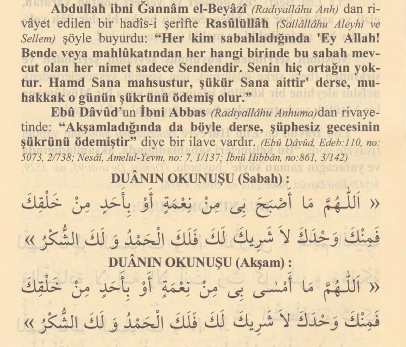 Allâhümme mâ asbaha bî min ni'metin ev bi ehadin min halqike feminke vahdeke lâ şerîke lek, felekel-hamdü ve lekeşşükr.
