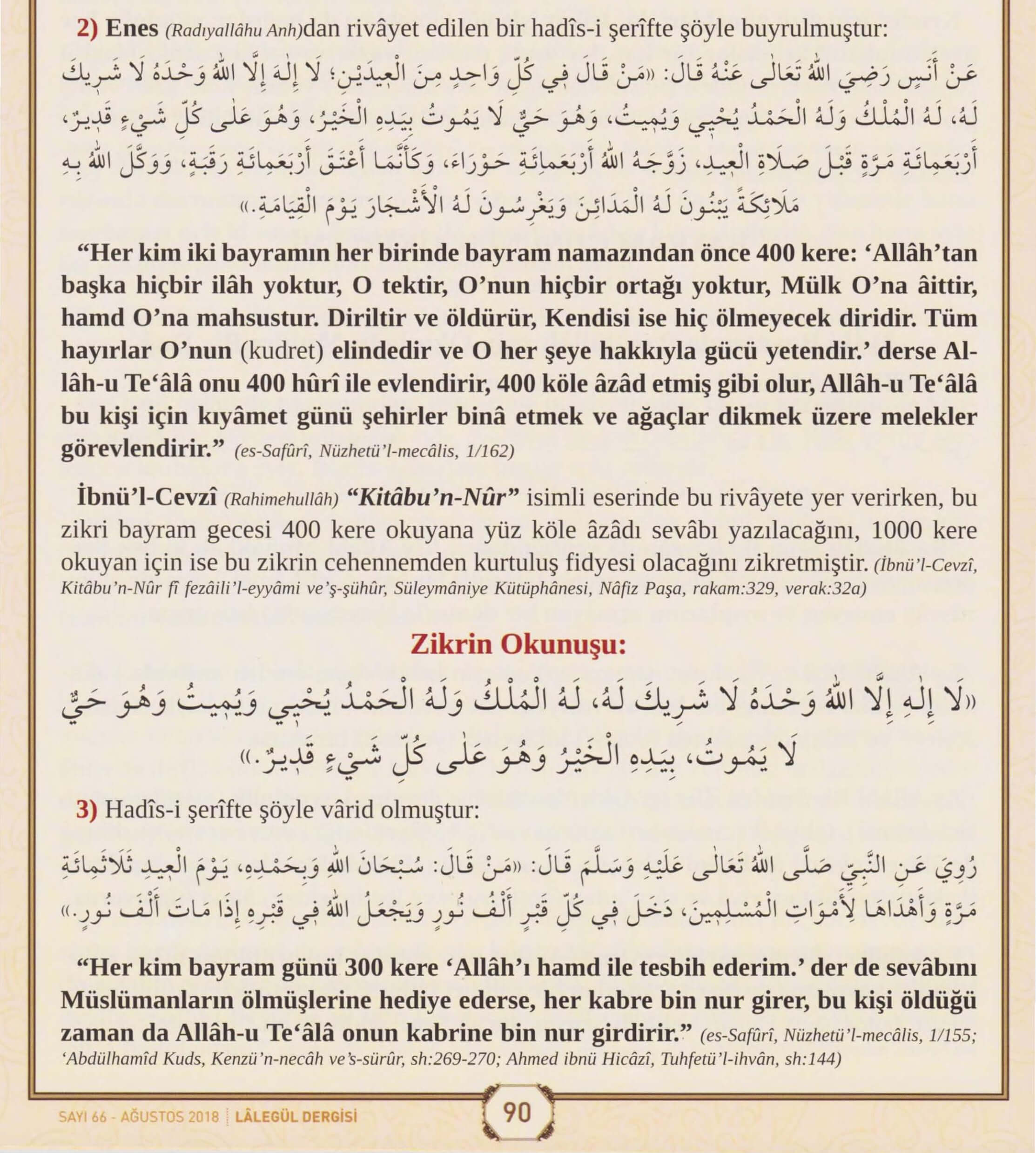 Lâ ilâhe illallâhu vahdehû lâ şerîke leh. Lehül-mülkü ve lehül-hamdü yuhyî ve yumît. Ve hüve hayyul-lâ yemût. Biyedihil-hayru ve hüve alâ külli şey in qadîr. (400 kere)