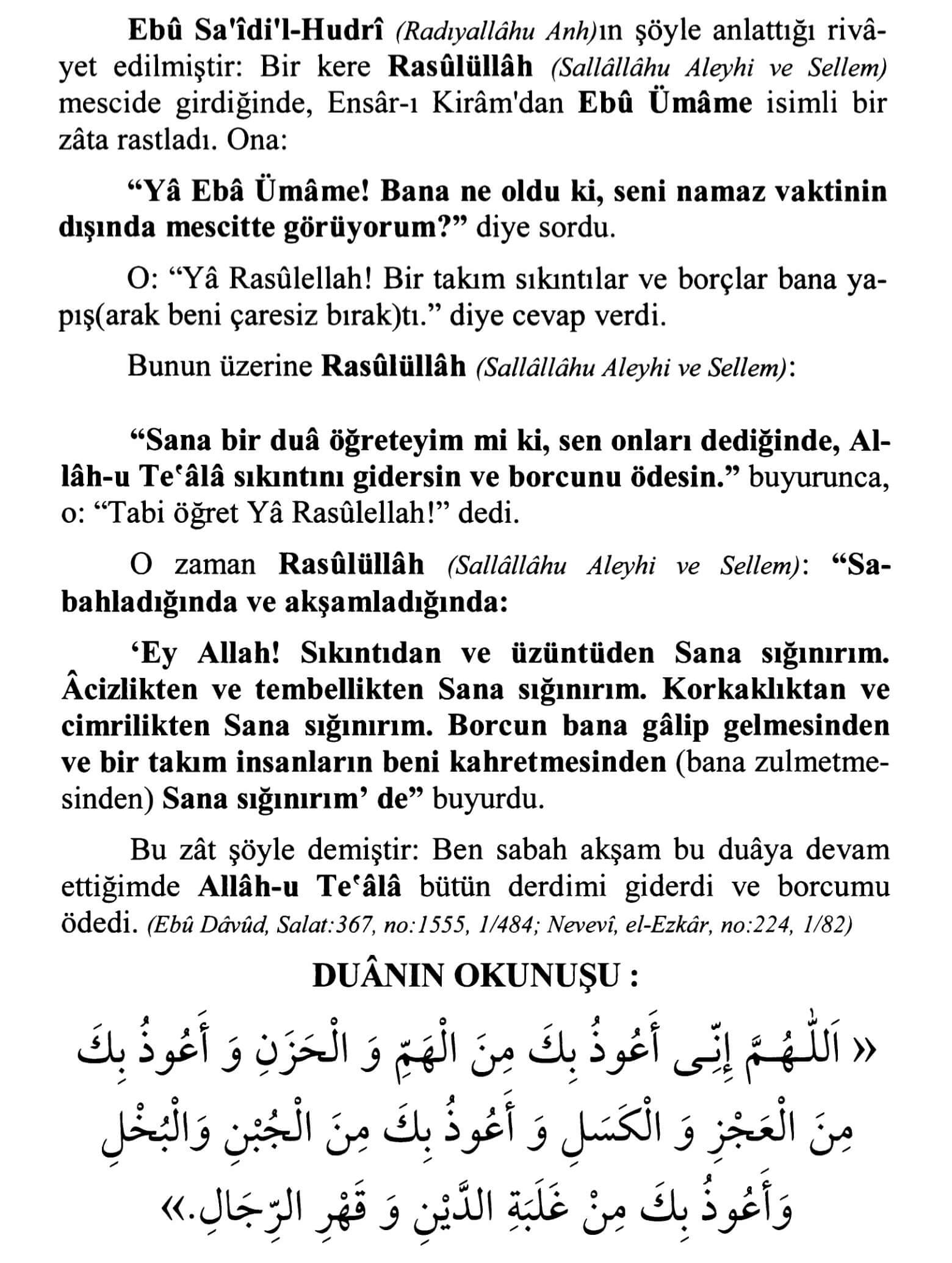 Allâhümme innî eûzü bike minel-hemmi vel-hazen. Ve eûzü bike minel-aczi vel-kesel. Ve eûzü bike minel-cübni vel-buhl. Ve eûzü bike min ğalebetiddeyni ve qahrir-ricâl.