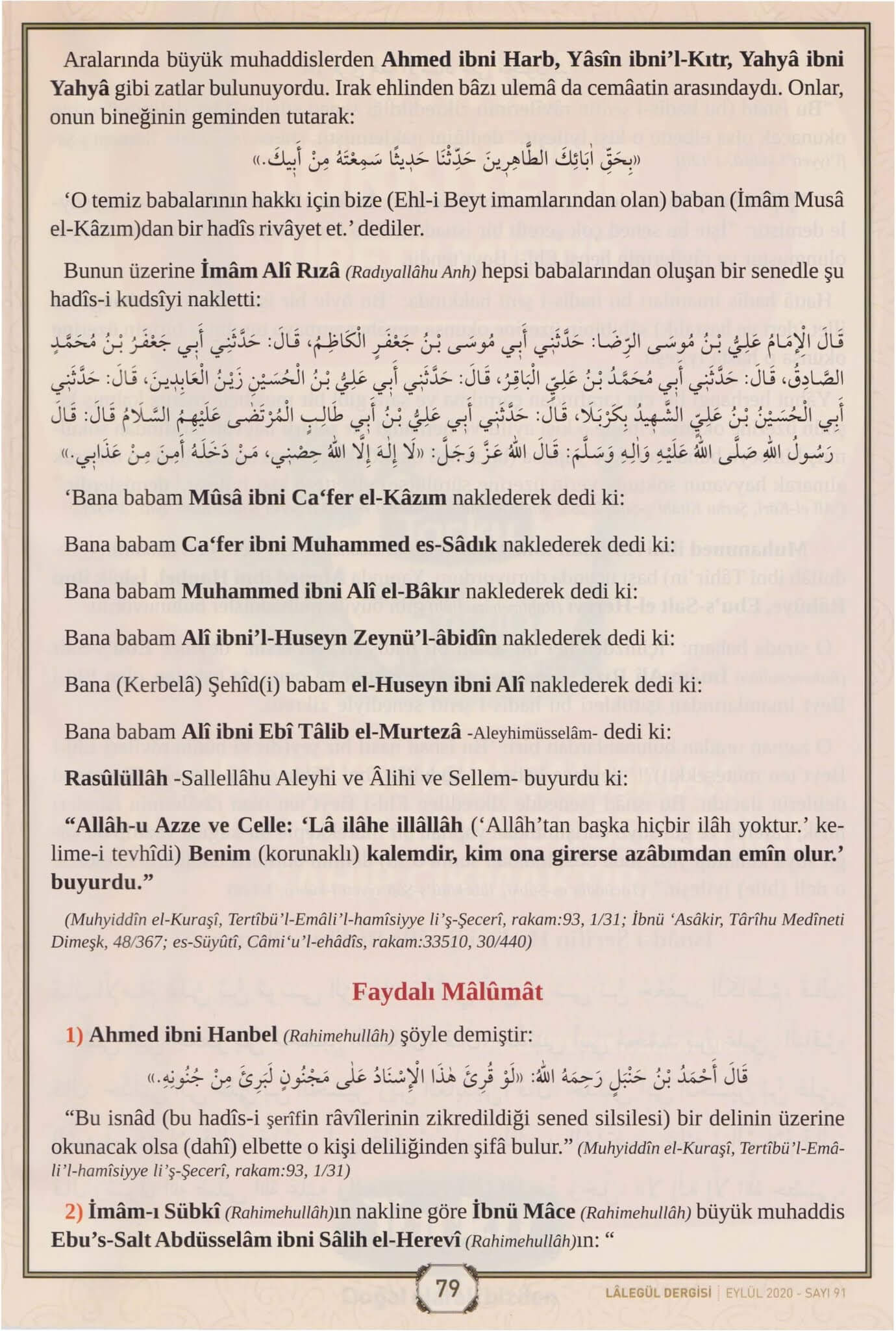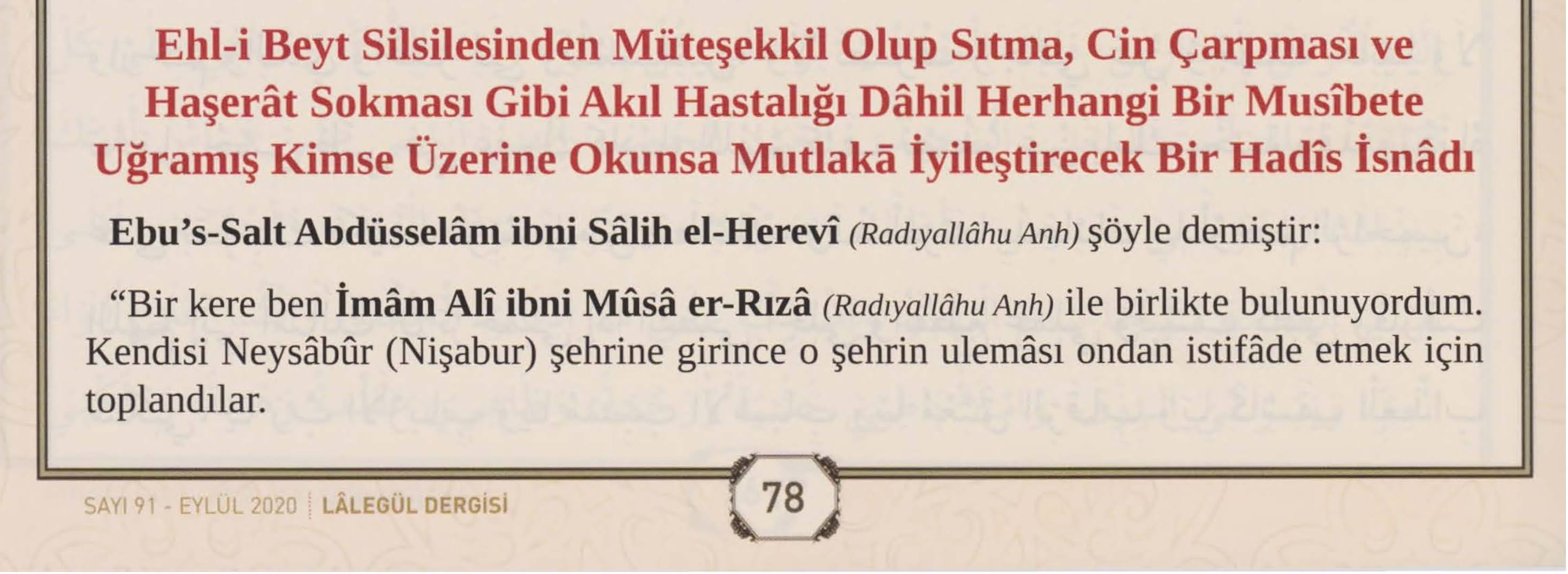 qâlel imâmü aliyyübnü mûserridâ: haddesenî ebî mûsebnü ca'ferinil kâzım. qâle: haddesenî ebî ca'ferübnü muhammedinissâdiq. qâle: haddesenî ebî muhammedübnü aliyyinil bâqir. qâle: haddesenî ebî aliyyübnül huseyni zeynül âbidîn. qâle: haddesenî ebil huseynübnü aliyyinişşehîdü bi kerbelâ. qâle: haddesenî ebî aliyyübnü ebî tâlibinil mürtedâ aleyhimüsselâmu qâle: qâle rasûlullâhi sallallâhu aleyhi ve âlihî sellem: qâlellâhu azze ve celle: lâ ilâhe illallâhu hısnî. men dehalehû emine min azâbî.
