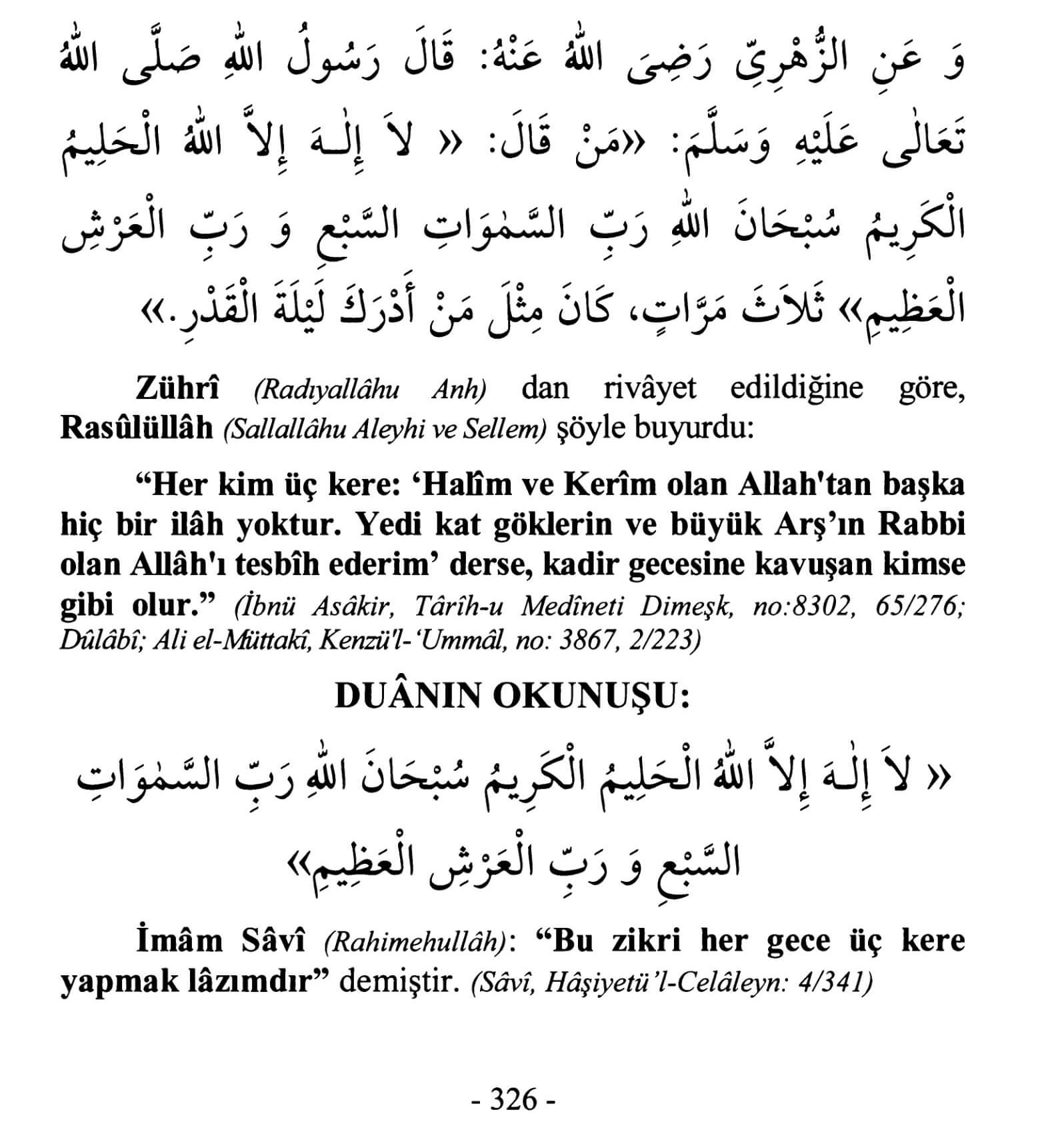 Lâ ilâhe illallâhul-halîmul-kerîm. Subhânallâhi rabbissemâvâtisseb-i ve rabbil-arşil-azîm.