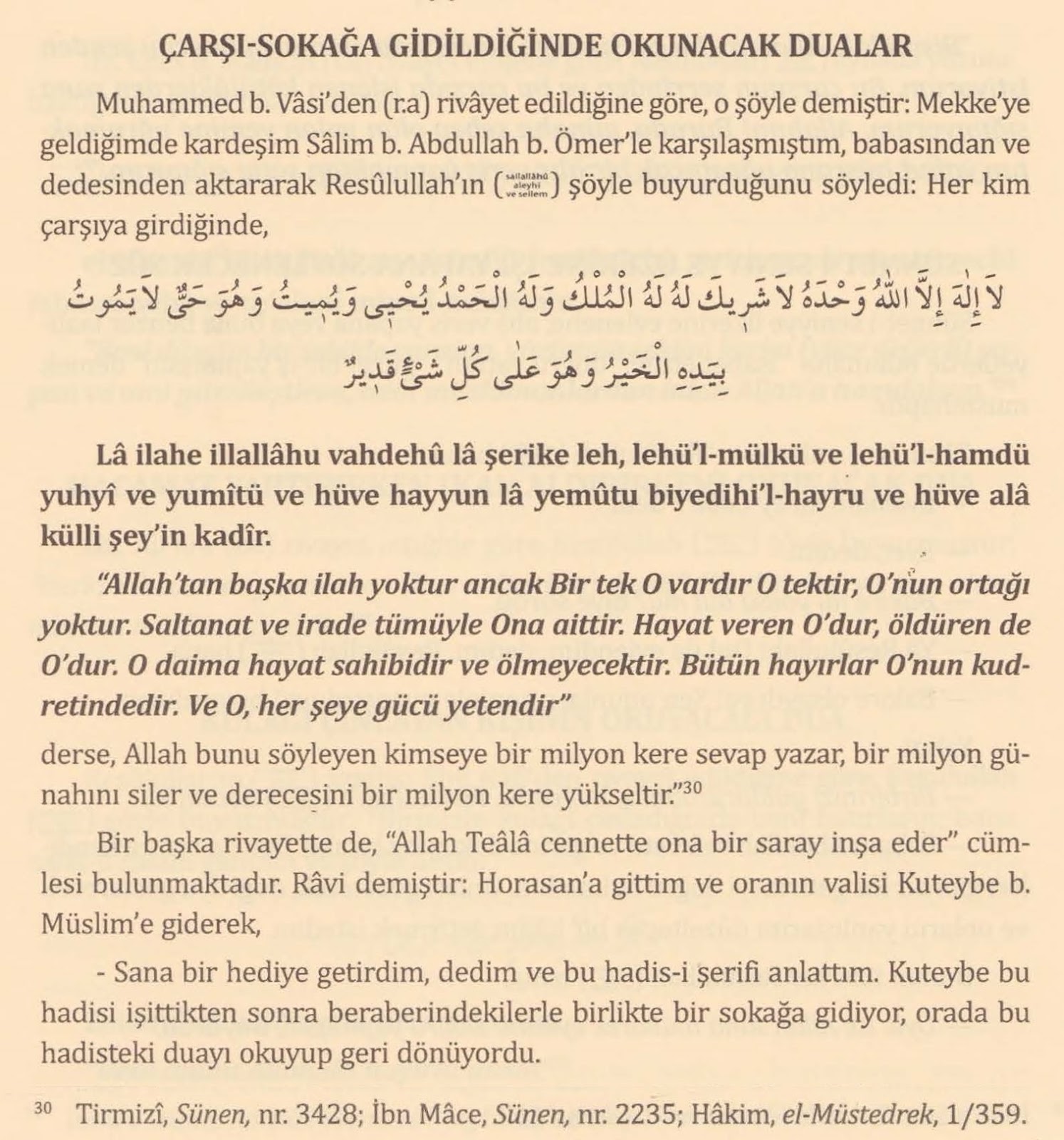 Lâ ilâhe illallâhu vahdehû lâ şerîke leh. Lehül mülkü ve lehül hamdü yuhyî ve yumît. Ve hüve hayyul-lâ yemût. Biyedihil hayru ve hüve alâ külli şey in qadîr.