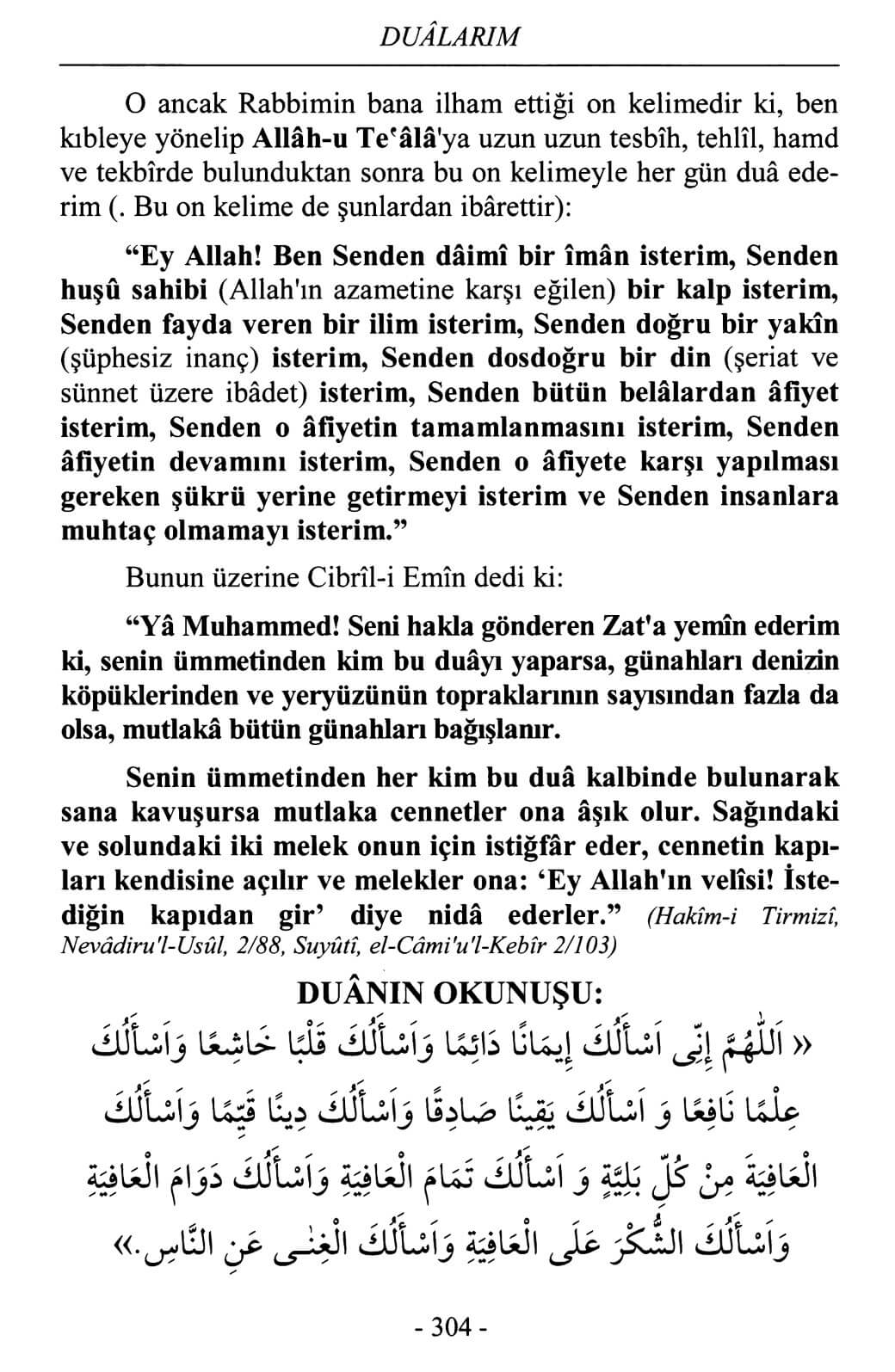 Allâhümme innî es-elüke îmânen dâimâ, ve es-elüke qalben hâşiâ, ve es-elüke ilmen nâfiâ, ve es-elüke yaqînen sâdiqâ, ve es-elüke dînen qayyimâ, ve es-elükel âfiyete min külli beliyyeh, ve es-elüke temâmel âfiyeh, ve es-elüke devâmel âfiyeh, ve es-elükeşşükra alel âfiyeh, ve es-elükel ğınâ aninnâs.
