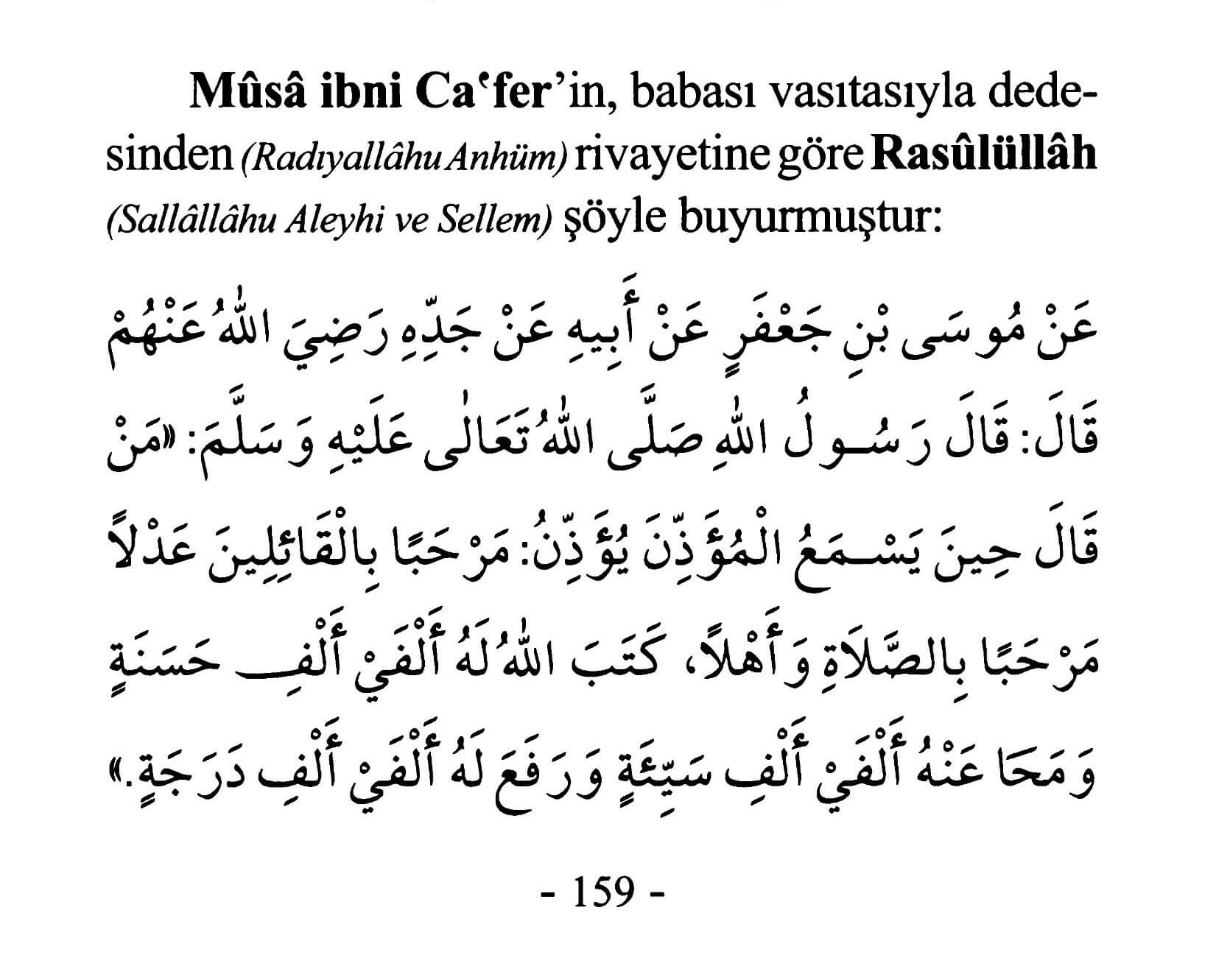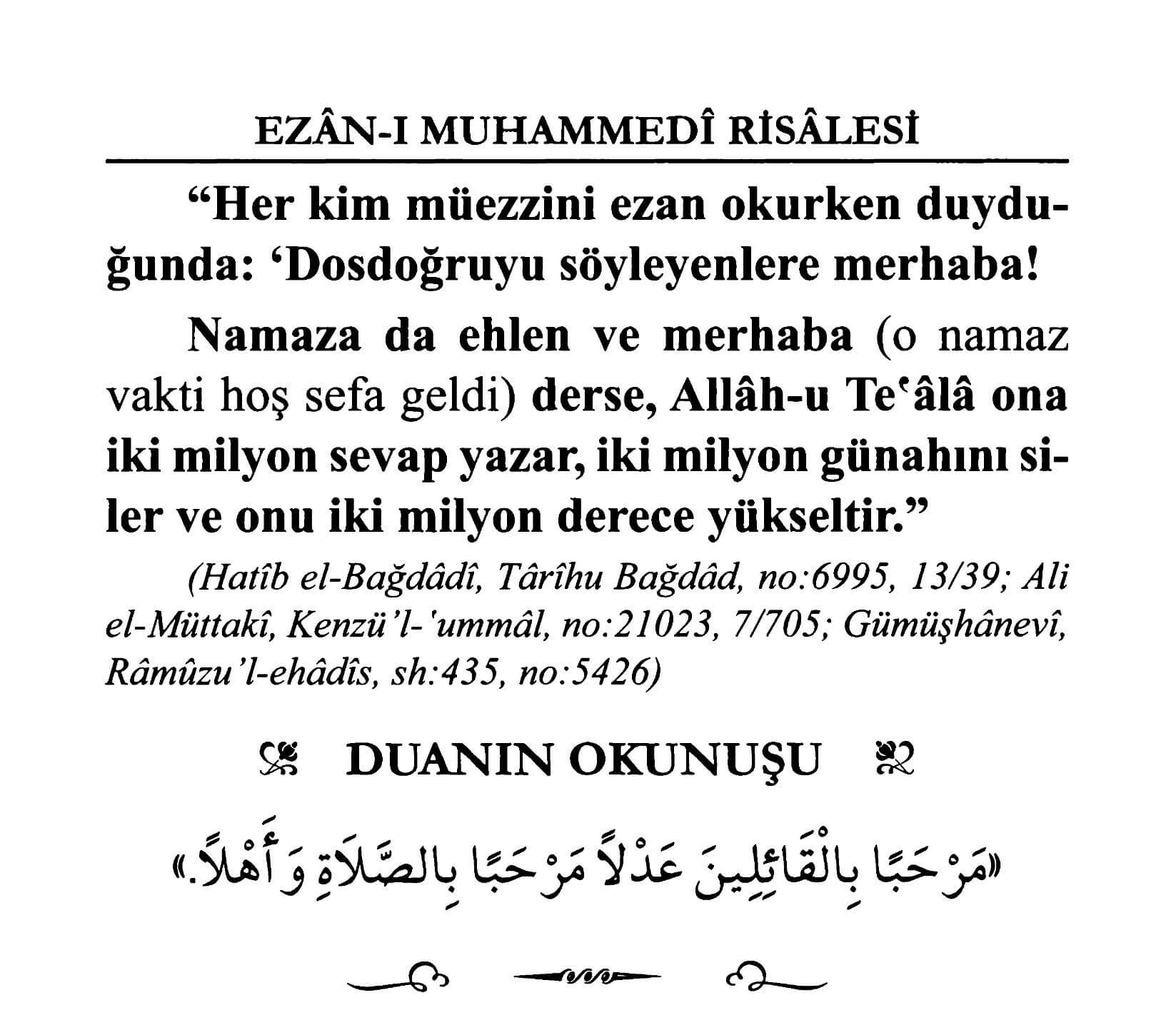 Çok Faziletli Tek Satır Ezan Duası31 Aralık 2023Ezan DualarıPaylaşPlayEzân-ı Muhammedî RisâlesiEzân-ı Muhammedî('nin Hükümleri, Faziletleri ve Müstecab Duaları) RisâlesiKitabı Satın AlEzân-ı Muhammedî Risâlesi, Sayfa 159 Ezân-ı Muhammedî Risâlesi, Sayfa 160 Okunuşu Merhaben bil-qâilîne adlâ, Merhaben bissalâti ve ehlâ.