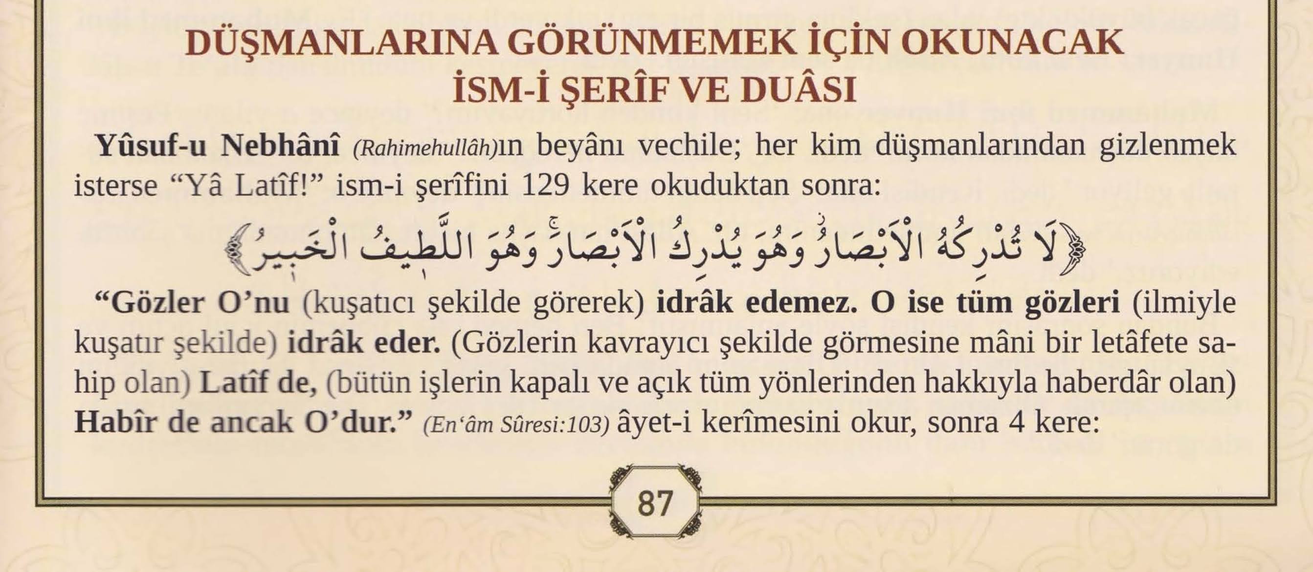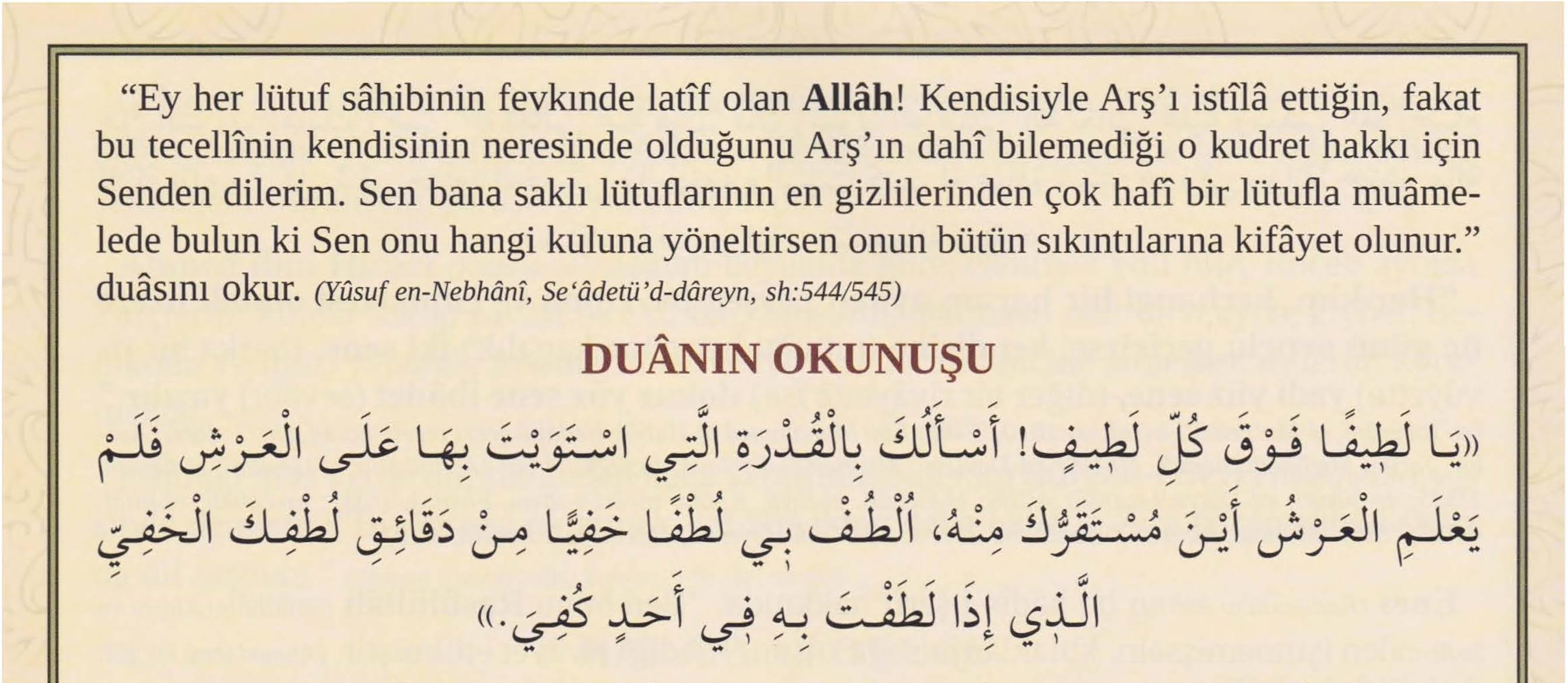 Yâ Latîfen fevqa külli latîf. Es-elüke bil qudratilletisteveyte bihâ alel arşi felem ya'lemil arşu eyne müsteqarruke minhü, ültuf bî lutfen hafiyyen min deqâiqi lutfikel-hafiyyillezî izâ letafte bihî fî ehadin küfiy.