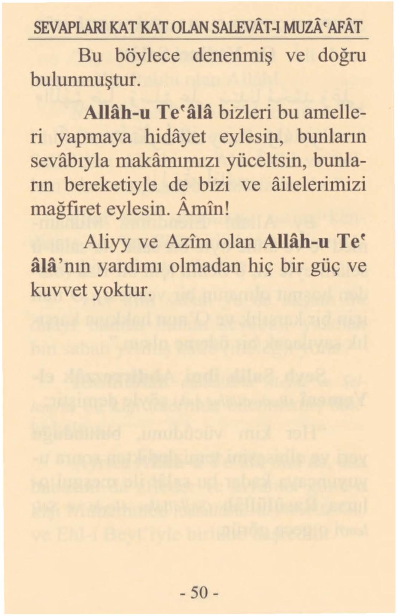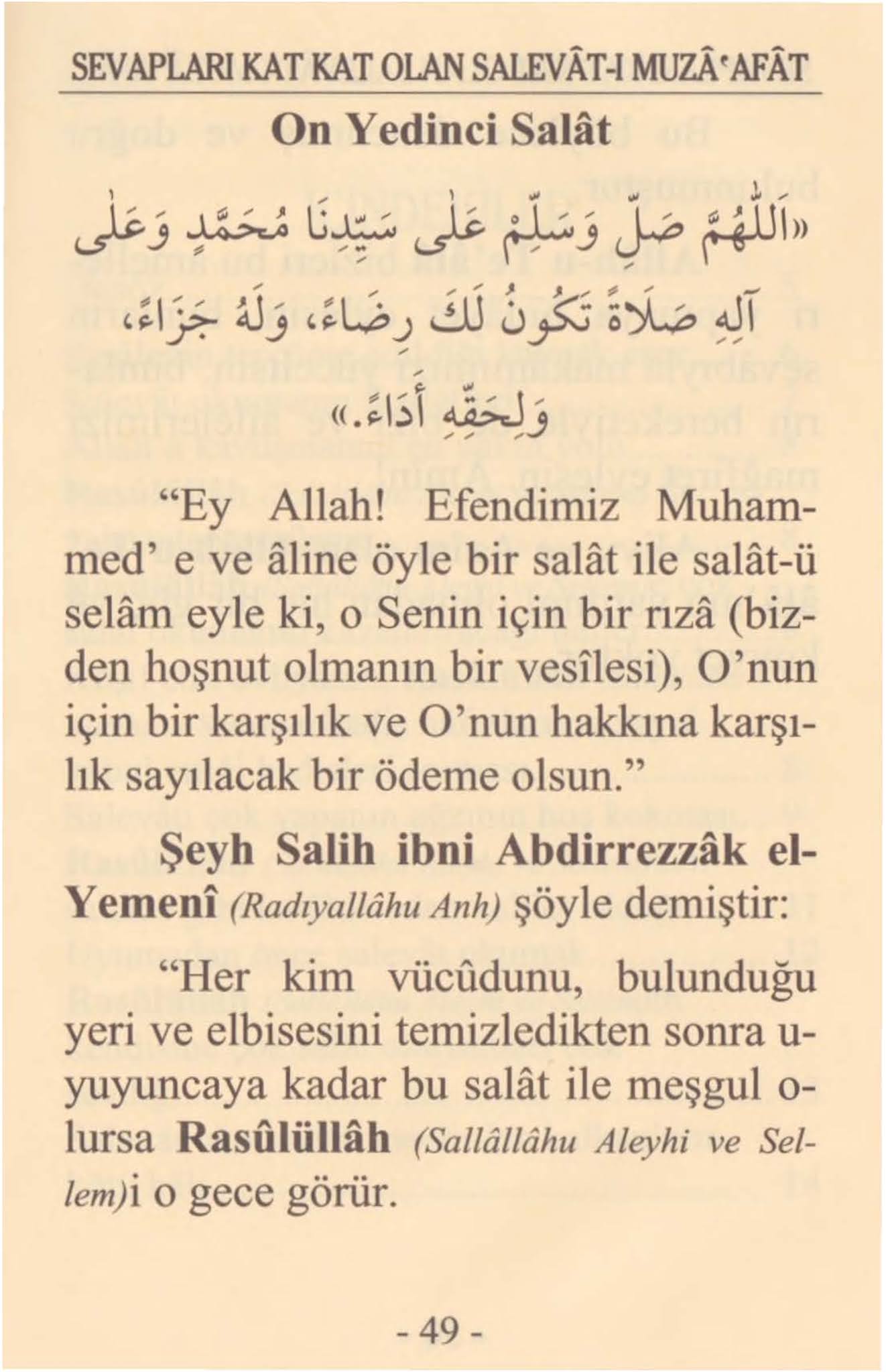 Allâhümme salli ve sellim alâ seyyidinâ Muhammedin ve alâ âlihi salâten tekûnu leke ridâ. Ve lehü cezâ. Ve lihaqqıhi edâ.