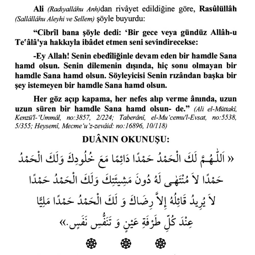 Allâhümme lekel-hamdü hamden dâimen mea hulûdik, ve lekel-hamdü hamden lâ müntehâ lehû dûne meşîetik, ve lekel-hamdü hamden lâ yurîdu qâiluhû illâ ridâk, ve lekel-hamdü hamden meliyyen inde külli tarfeti aynin ve teneffüsi nefes.