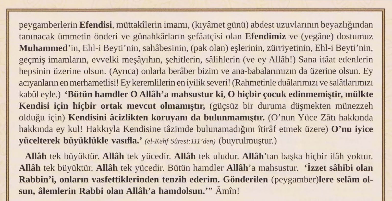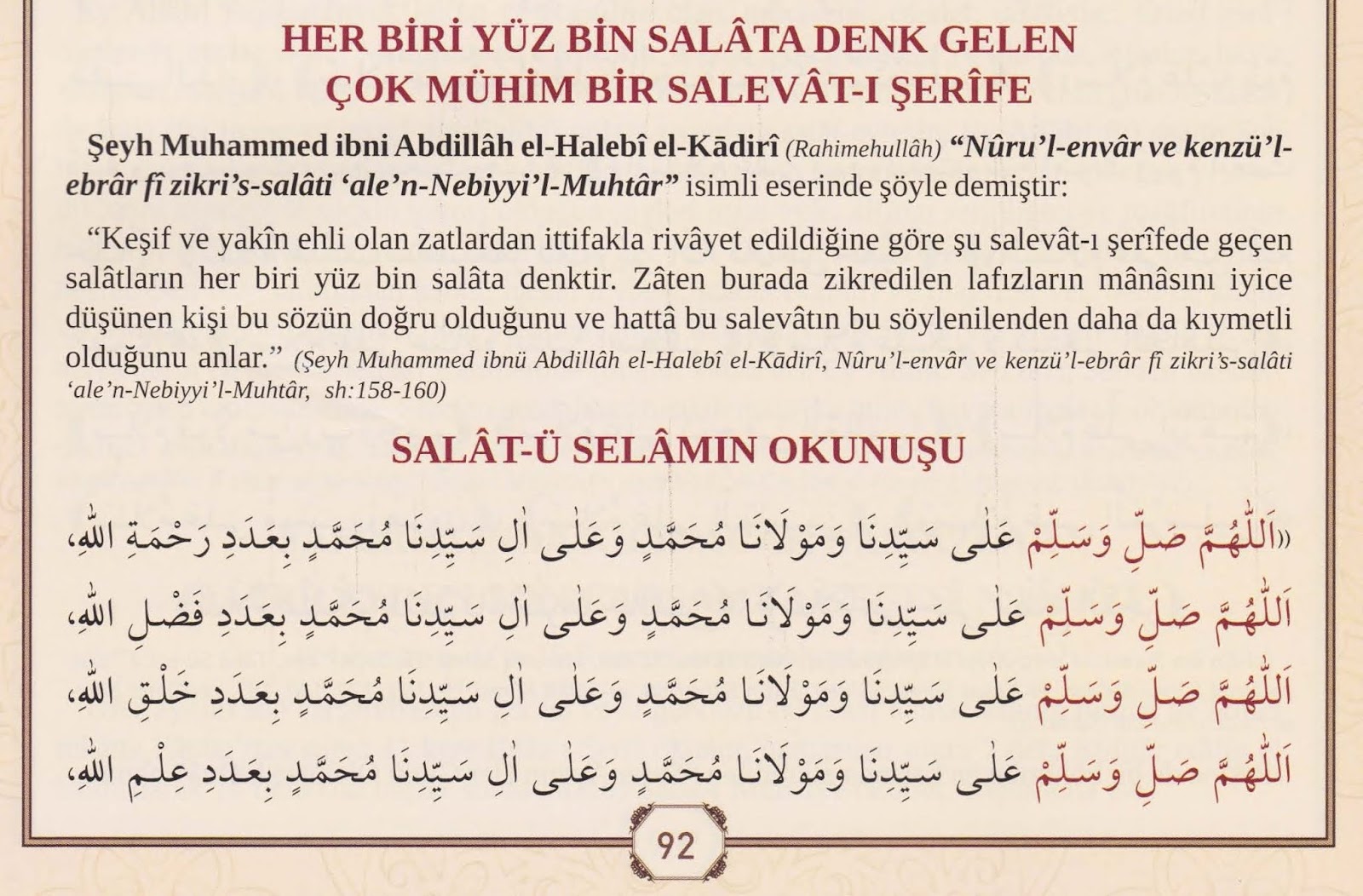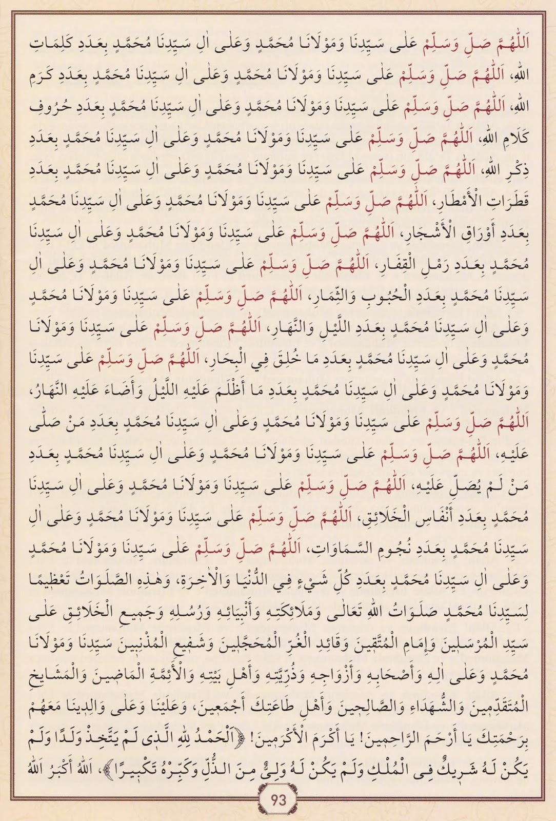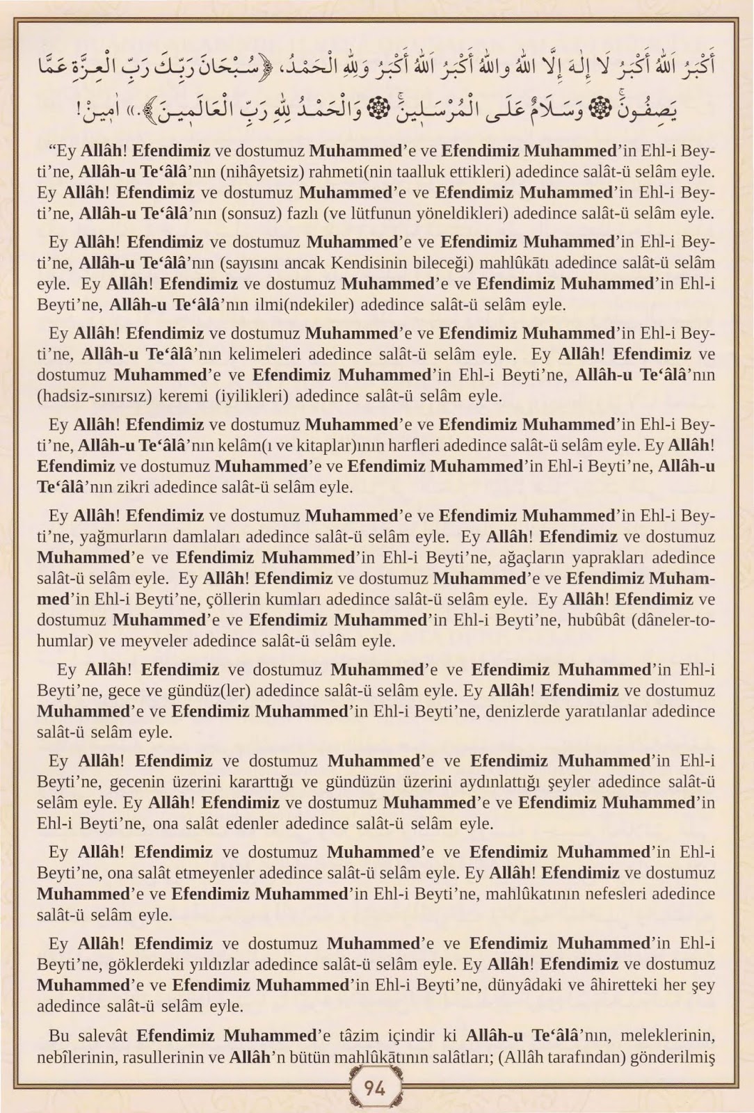 Allâhümme salli ve sellim alâ seyyidinâ ve mevlânâ Muhammedin ve alâ âli seyyidinâ Muhammedin bi adedi rahmetillâh. Allâhümme salli ve sellim alâ seyyidinâ ve mevlânâ Muhammedin ve alâ âli seyyidinâ Muhammedin bi adedi fadlillâh. Allâhümme salli ve sellim alâ seyyidinâ ve mevlânâ Muhammedin ve alâ âli seyyidinâ Muhammedin bi adedi halqillâh. Allâhümme salli ve sellim alâ seyyidinâ ve mevlânâ Muhammedin ve alâ âli seyyidinâ Muhammedin bi adedi ilmillâh. Allâhümme salli ve sellim alâ seyyidinâ ve mevlânâ Muhammedin ve alâ âli seyyidinâ Muhammedin bi adedi kelimâtillâh. Allâhümme salli ve sellim alâ seyyidinâ ve mevlânâ Muhammedin ve alâ âli seyyidinâ Muhammedin bi adedi keramillâh. Allâhümme salli ve sellim alâ seyyidinâ ve mevlânâ Muhammedin ve alâ âli seyyidinâ Muhammedin bi adedi hurûfi kelâmillâh. Allâhümme salli ve sellim alâ seyyidinâ ve mevlânâ Muhammedin ve alâ âli seyyidinâ Muhammedin bi adedi zikrillâh. Allâhümme salli ve sellim alâ seyyidinâ ve mevlânâ Muhammedin ve alâ âli seyyidinâ Muhammedin bi adedi qatarâtil emtâr. Allâhümme salli ve sellim alâ seyyidinâ ve mevlânâ Muhammedin ve alâ âli seyyidinâ Muhammedin bi adedi evrâqil eşcâr. Allâhümme salli ve sellim alâ seyyidinâ ve mevlânâ Muhammedin ve alâ âli seyyidinâ Muhammedin bi adedi ramlil qifâr. Allâhümme salli ve sellim alâ seyyidinâ ve mevlânâ Muhammedin ve alâ âli seyyidinâ Muhammedin bi adedil hubûbi vessimâr. Allâhümme salli ve sellim alâ seyyidinâ ve mevlânâ Muhammedin ve alâ âli seyyidinâ Muhammedin bi adedilleyli vennehâr. Allâhümme salli ve sellim alâ seyyidinâ ve mevlânâ Muhammedin ve alâ âli seyyidinâ Muhammedin bi adedi mâ huliqa fil bihâr. Allâhümme salli ve sellim alâ seyyidinâ ve mevlânâ Muhammedin ve alâ âli seyyidinâ Muhammedin bi adedi mâ azleme aleyhilleylü ve edâe aleyhinnehâr. Allâhümme salli ve sellim alâ seyyidinâ ve mevlânâ Muhammedin ve alâ âli seyyidinâ Muhammedin bi adedi men sallâ aleyh. Allâhümme salli ve sellim alâ seyyidinâ ve mevlânâ Muhammedin ve alâ âli seyyidinâ Muhammedin bi adedi mel-lem yusalli aleyh. Allâhümme salli ve sellim alâ seyyidinâ ve mevlânâ Muhammedin ve alâ âli seyyidinâ Muhammedin bi adedi enfâsil halâiq. Allâhümme salli ve sellim alâ seyyidinâ ve mevlânâ Muhammedin ve alâ âli seyyidinâ Muhammedin bi adedi nucûmissemâvât. Allâhümme salli ve sellim alâ seyyidinâ ve mevlânâ Muhammedin ve alâ âli seyyidinâ Muhammedin bi adedi külli şey in fiddünyâ vel âhirah. Ve hâzihissalevâtü ta'zîmen liseyyidinâ Muhammedin salevâtullâhi teâlâ ve melâiketihî ve enbiyâihî ve rusûlihî ve cemî-il halâiqi alâ seyyidil mürselîn, ve imâmil müttaqîn, ve qâidil ğurril muhaccelîn, ve şefî-il müznibîn, seyyidinâ ve mevlânâ Muhammedin ve alâ âlihî ve ashâbihî ve ezvâcihî ve zürriyyetihî ve ehli beytihî vel eimmetil mâdîne vel meşâyihil müteqaddimîne veşşühedâi vessâlihîne ve ehli tâ-atike ecmaîn. Ve aleynâ ve alâ vâlidînâ meahüm birahmetike yâ erhamerrâhimîn. Yâ ekramel ekramîn. [ Elhamdülillâhillezî lem yettehiz veledev-velem yeküllehû şerîkün fil mülki velem yeküllehû veliyyum-minezzülli ve kebbirhu tekbîrâ. ] Allâhu ekber, Allâhu ekber, Allâhu ekber, lâ ilâhe illallâhu vallâhu ekber, Allâhu ekber ve lillâhil-hamd. [ Subhâne rabbike rabbil izzeti ammâ yesıfûn. Ve selâmun alel mürselîn. Velhamdülillâhi rabbil âlemîn. ] Âmîn.