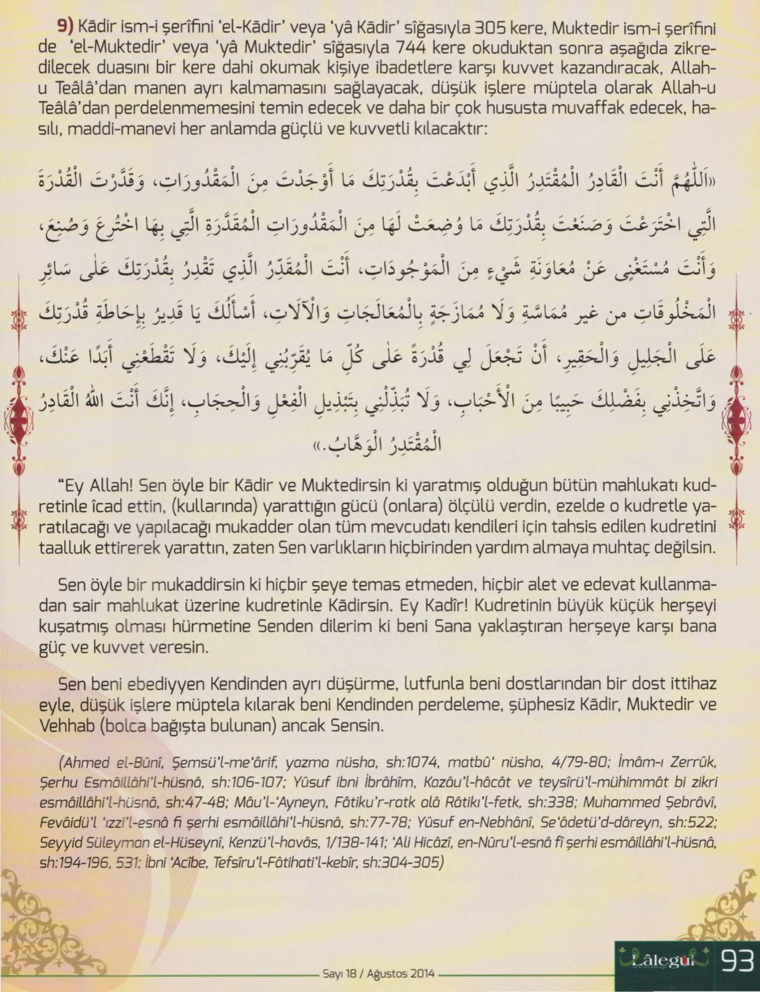 Allâhümme entel-qâdirul-muqtedirullezî ebda'te biqudratike mâ evcedte minel-maqdûrât. Ve qaddertel-qudratelletihtera'te ve sana'te biqudratike mâ vudıat lehâ minel-maqdûrâtil-muqadderatilletî bihahtüria ve sunia. Ve ente müstağnin an müâveneti şey in minel-mevcûdât. Entel-muqaddirullezî taqdiru biqudratike alâ sâiril-mahlûqâti min ğayri mümâsseti ve lâ mümâzecetin bil-müâlecâti vel âlât. Es-elüke yâ qadîru bi ihâtati qudratike alel-celîli vel-haqîr. En tec-ale lî qudraten alâ külli mâ yuqarribunî ileyk. Ve lâ taqta'nî ebeden ank. Vettehiznî bi fadlike habîben minel-ahbâb. Ve lâ tübezzilnî bitebzîlil-fi'li vel-hicâb. İnneke entallâhul-qâdirul-muqtedirul-vehhâb.