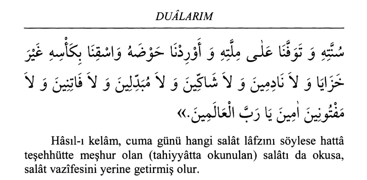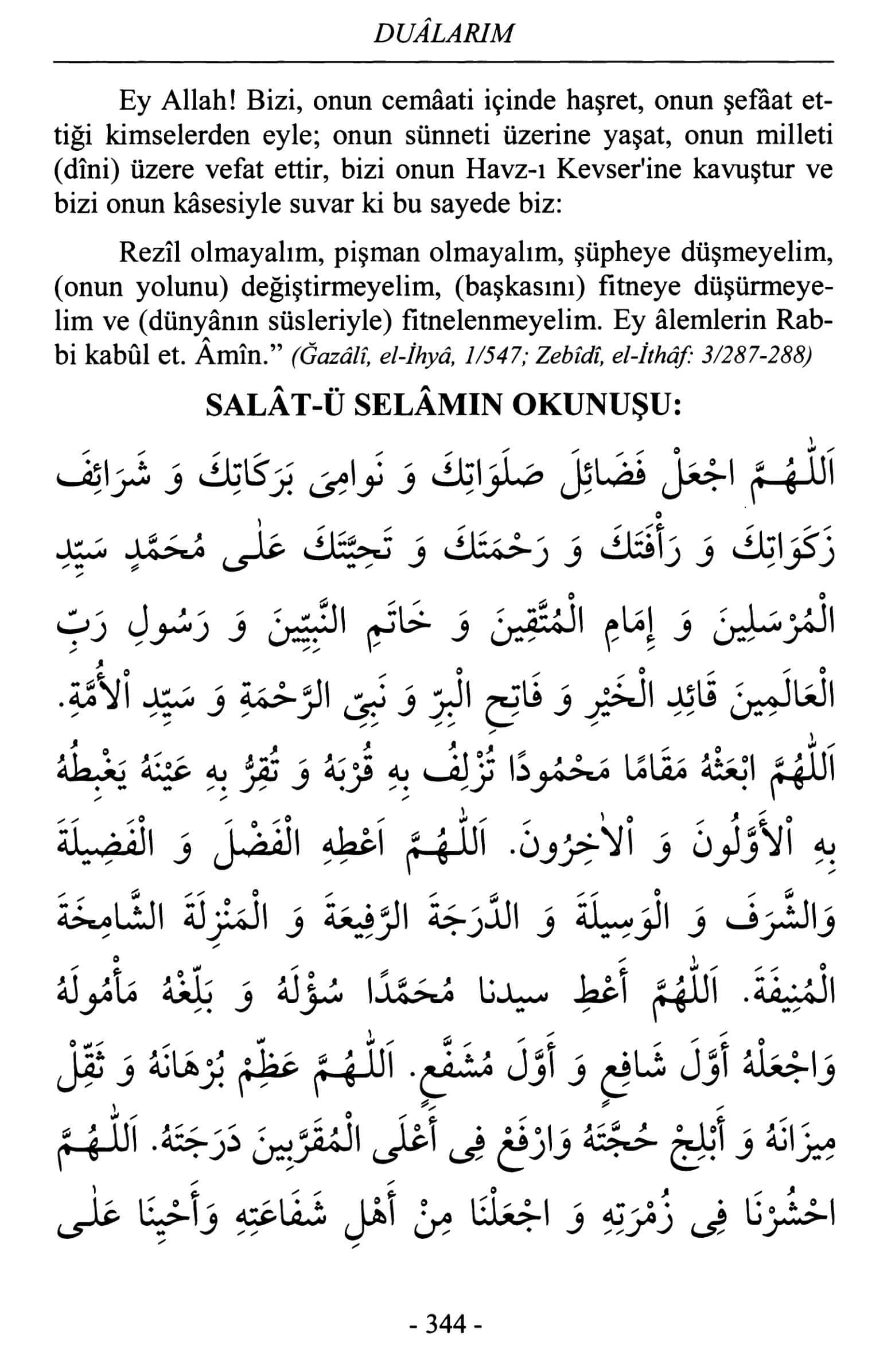 Allâhümmec-al fedâile salevâtik, ve nevâmiye berakâtik, ve şerâife zekevâtik, ve ra'feteke ve rahmeteke ve tehiyyetek, alâ Muhammedin seyyidil-mürselîn, ve imâmil-mütteqîn, ve hâteminnebiyyîn, ve rasûli rabbil-âlemîn, qâidil-hayr, ve fâtihil-birr, ve nebiyyirrahmeh, ve seyyidil-ümmeh. Allâhümmeb-ashü meqâmen mahmûdâ, tüzlifu bihî qurbeh, ve tüqirru bihî ayneh, yağbituhû bihil-evvelûne vel-âhirûn. Allâhümme a'tıhil-fadle vel-fadîleh, veşşerafe vel-vesîleh, vedderaceterrafîah, vel-menzileteşşâmihatel-münîfeh. Allâhümme a'ti seyyidenâ Muhammeden sü'leh, ve belliğhu me'mûleh, vec-alhü evvele şâfi-in ve evvele müşeffa'. Allâhümme azzım burhâneh, ve seqqil-mîzâneh, ve eblic hucceteh, verfa' fî a'lel muqarrabîne deraceteh. Allâhümmahşurnâ fî zümratih, vec-alnâ min ehli şefâ-atih, ve ahyinâ alâ sünnetih, ve teveffenâ alâ milletih, ve evridnâ havdah, vesqinâ bi ke'sih, ğayra hazâyâ ve lâ nâdimîn, ve lâ şâkkîne ve lâ mübeddilîn, ve lâ fâtinîne ve lâ meftûnîn. Âmîn. Yâ rabbel-âlemîn.