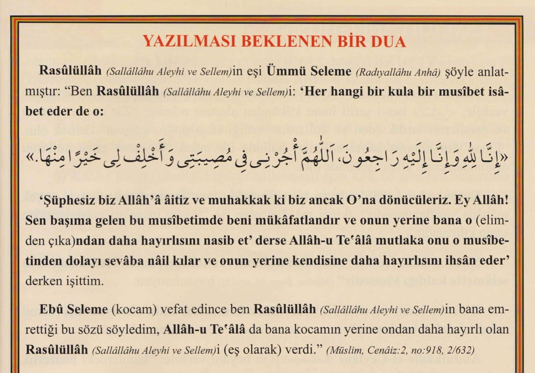 İnnâ lillâhi ve innâ ileyhi râciûn. Allâhümme'curnî fî musîbetî ve ehliflî hayran minhâ.