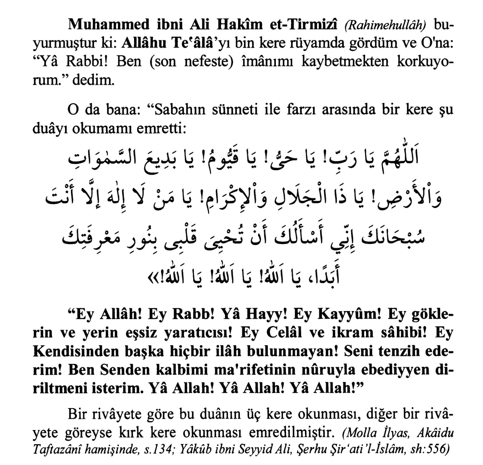 Kafir Olmaktan Korunmak İçin Okunacak Dua31 Ocak 2026Hüsn-ü HatimePaylaşPlayDualarımUykudan Uyanıştan İtibaren Yatıncaya Kadar Rasûlüllâh (Sallallâhu Aleyhi Ve Sellem)in Bir Gün Içinde Okuduğu Rivâyet Olunan, Dolayısıyla O'nun Ümmetinin Her Ferdinin Dualarım Diye Sahip Çıkarak Amel Etmesi Sünnet Olan Dua ve ZikirlerKitabı Satın AlDualarım, Sayfa 70-71 Okunuşu Cübbeli Ahmet Hoca okuyor00:00 / 00:00 Allâhümme Yâ Rabb! Yâ hayy! Yâ qayyûm! Yâ bedîassemâvâti vel ard. Yâ zel celâli vel ikrâm. Yâ men lâ ilâhe illâ ente subhâneke innî es-elüke en tuhyiye qalbî bi nûri ma'rifetike ebeden Yâ Allâh! Yâ Allâh! Yâ Allâh!