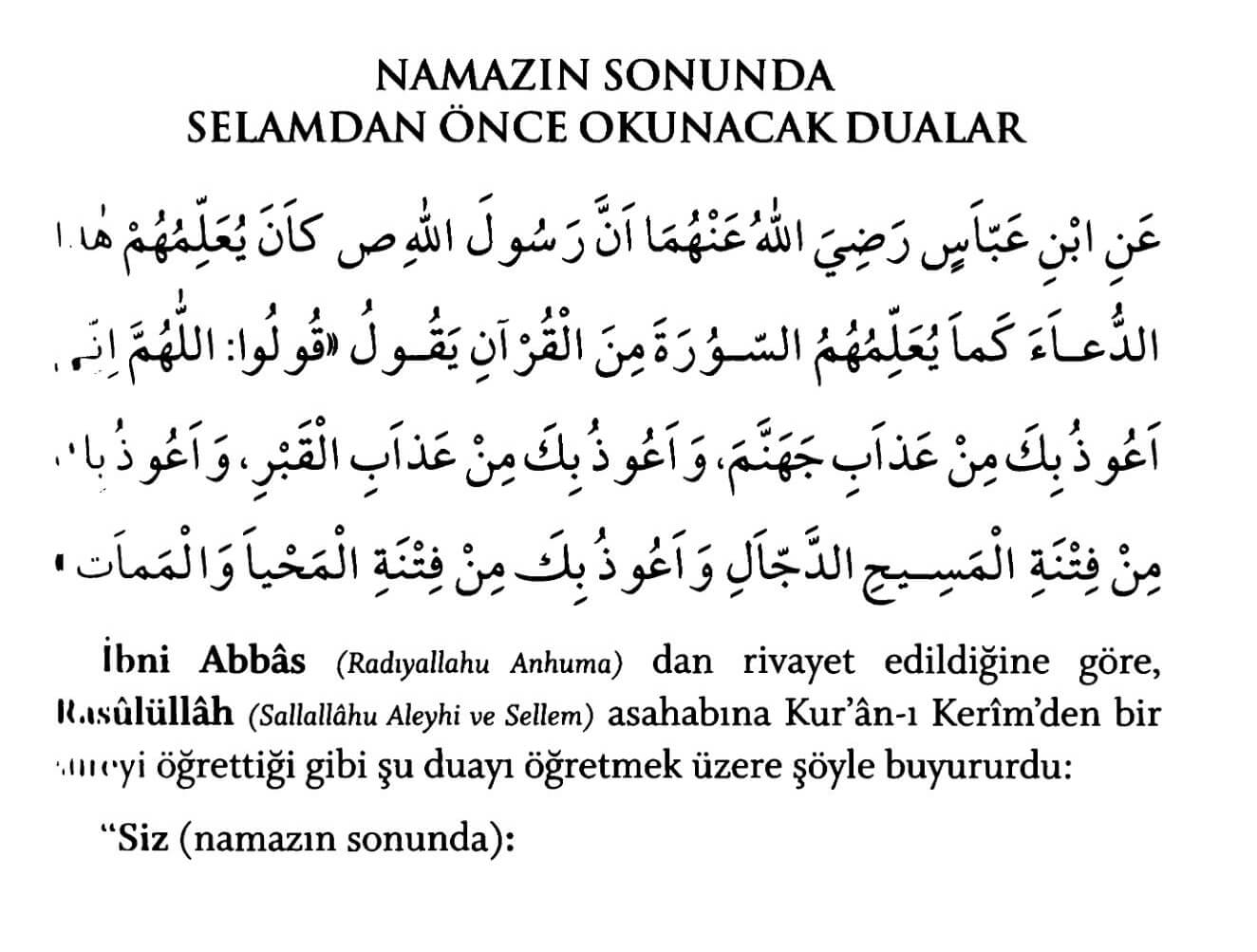 Allâhümme innî eûzü bike min azâbi cehennem. Ve eûzü bike min azâbil-qabr. Ve eûzü bike min fitnetil-mesîhid-deccâl. Ve eûzü bike min fitnetil-mahyâ vel-memât.