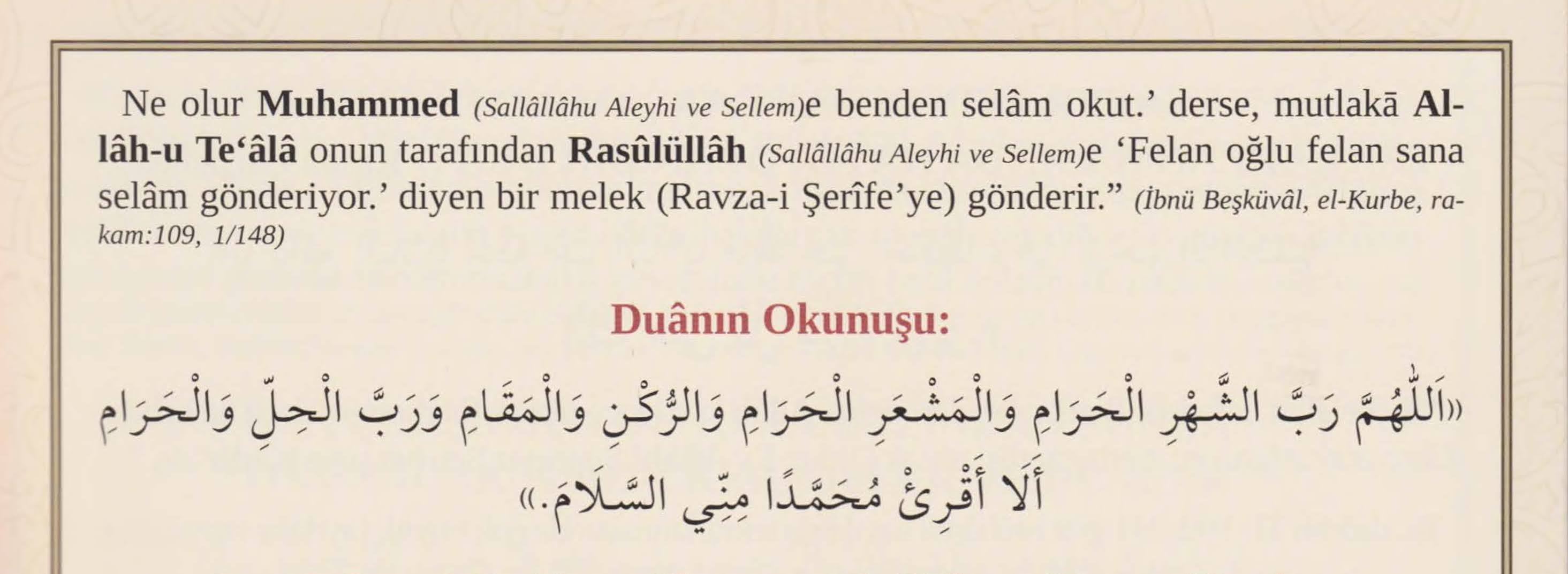 Allâhümme rabbeşşehril harâmi vel meş-aril harâmi verrukni vel meqâmi ve rabbel hilli vel harâmi elâ eqri' Muhammeden minnisselâm.