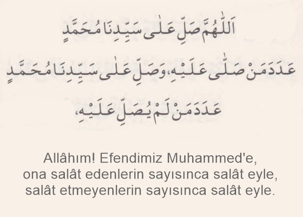 Allâhümme salli alâ seyyidinâ Muhammedin adede men sallâ aleyh. Ve salli alâ seyyidinâ Muhammedin adede men lem yusalli aleyh.