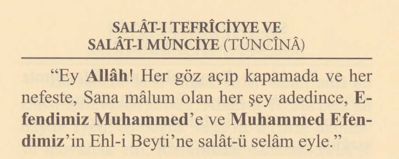 Allâhümme salli ve sellim alâ seyyidinâ Muhammedin ve alâ âli seyyidinâ Muhammedin fî külli lemhatin ve nefesin bi adedi külli ma'lûmillek.