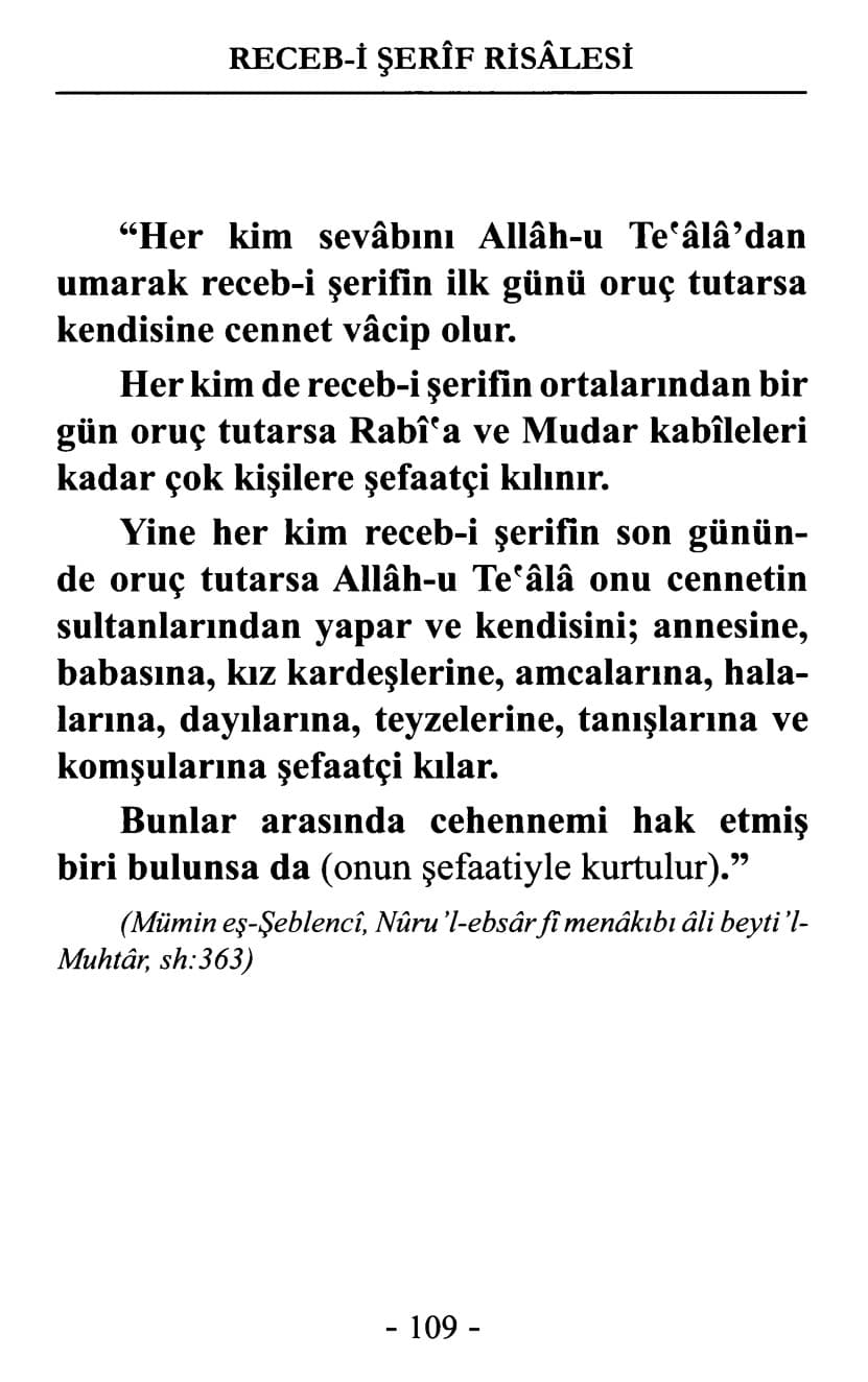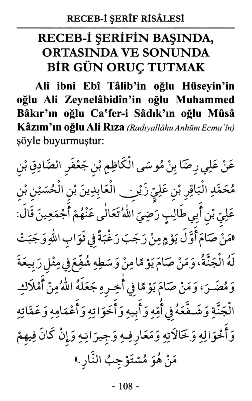 Receb-i Şerif'in Başında, Ortasında ve Sonunda 1 Gün Oruç Tutmak15 Ocak 2023Receb-i ŞerifPaylaşPlayReceb-i Şerîf RisâlesiReceb-i Şerîf'te Yapılacak Fazîletli Zikirler, Duâlar ve Sâlih Ameller RisâlesiKitabı Satın AlReceb-i Şerif Risalesi, Sayfa 108 Receb-i Şerif Risalesi, Sayfa 109