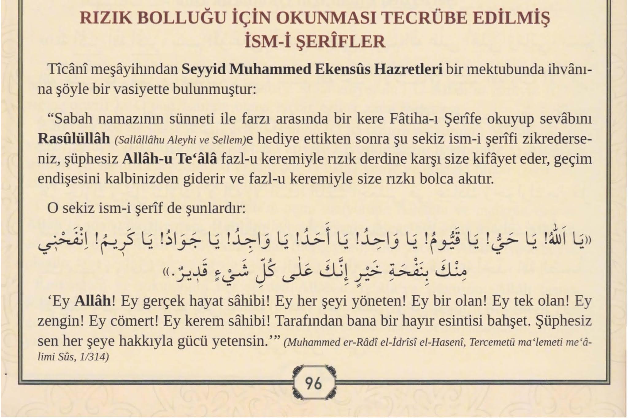 Yâ Allâhu Yâ Hayyu Yâ qayyûmu Yâ Vâhidu Yâ Ehadu Yâ Vâcidu Yâ Cevâdu Yâ Kerîm. İnfahnî minke bi nefhati hayr. inneke alâ külli şey in qadîr.