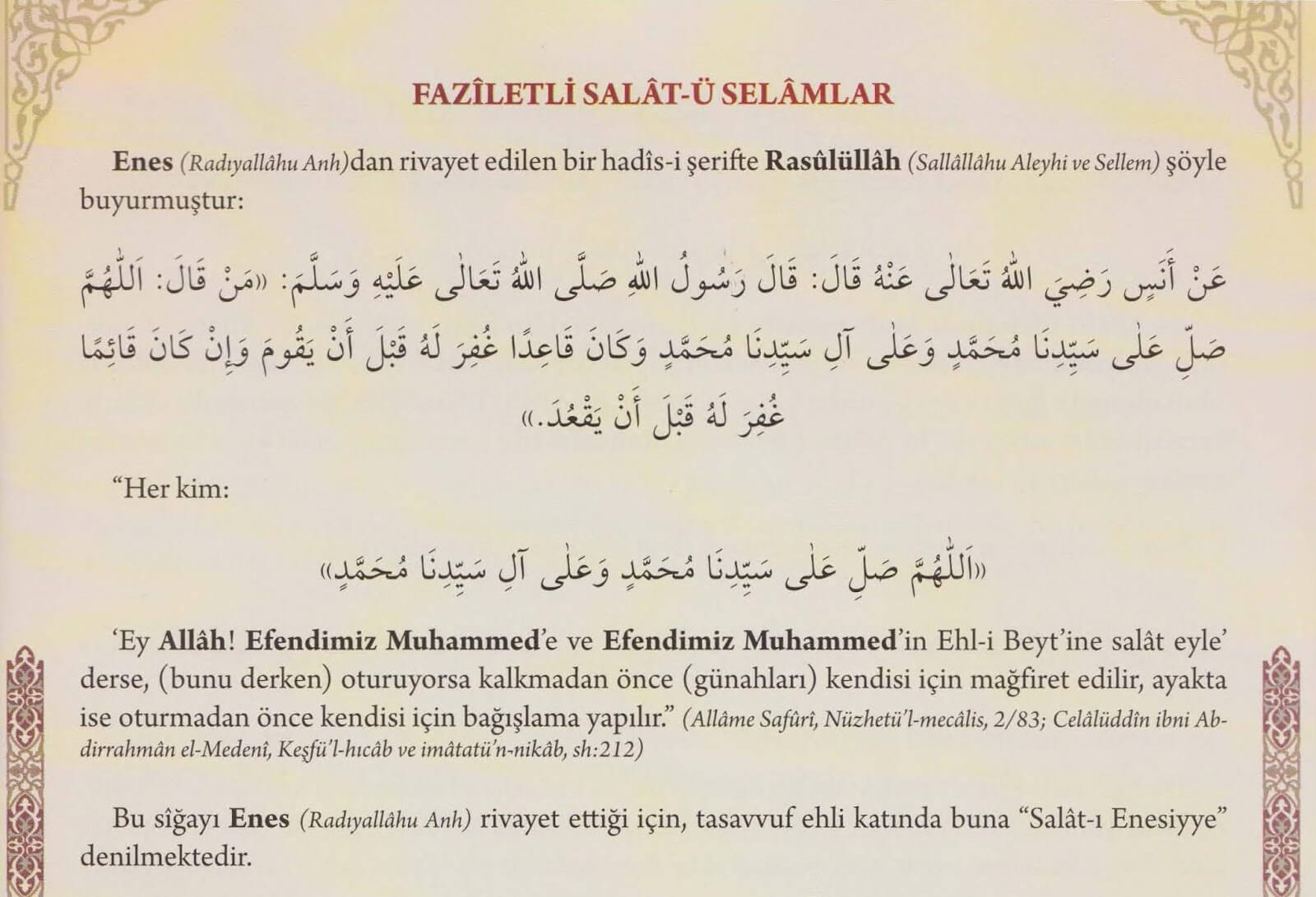 Salâtı Enesiyye16 Temmuz 2023Salevât-ı ŞerîfelerPaylaşPlayLalegül Dergisi Mayıs 2015, Sayfa 83 Okunuşu Allâhümme salli alâ seyyidinâ Muhammedin ve alâ âli seyyidinâ Muhammed.