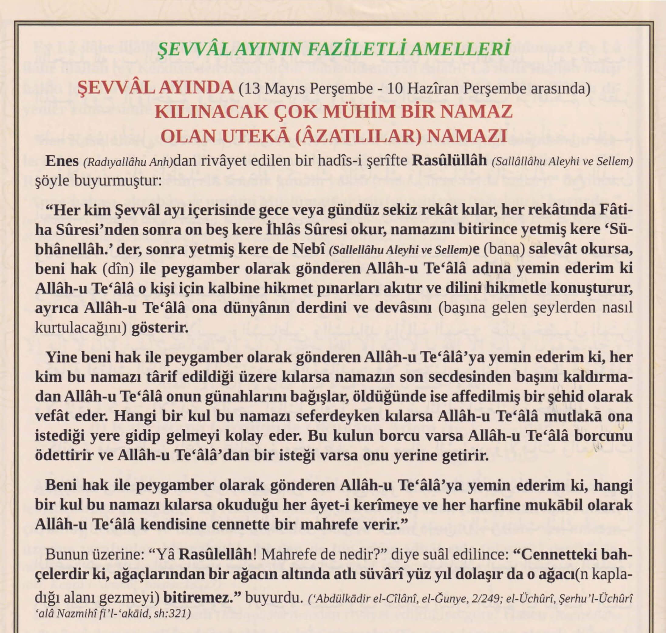 Şevval Ayında Kılınacak Çok Faziletli Uteka (Azatlılar) Namazı
