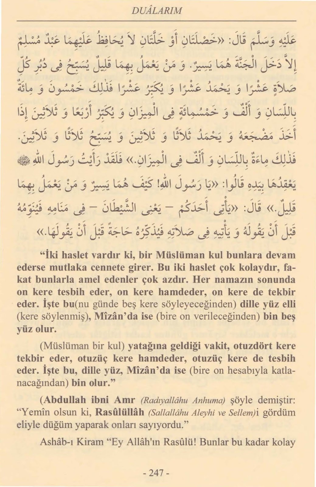 – İmâm-ı Rabbânî, Mektûbât 1. Cild 309. MektupAllahü teâlâya hamd olsun! Sevgili Peygamberi Muhammed aleyhisselâma salât ve selâm olsun! Din ve dünyâ se’âdetinize düâ ederim. Meşâyıh-ı kirâmdan birçoğu “kaddesallahü teâlâ esrârehüm”, muhâsebe yolunu seçmişlerdir. Her gece, yatacağı zemân, o gün yapmış olduğu işlerini, sözlerini, hareketlerini, hareketsizliklerini, düşüncelerini, herbirinin niçin olduğunu anlarlar. Kusûrlarını ve günâhlarını temizlemek için, tevbe ve istigfâr ederler. Allahü teâlâya boyun bükerler, yalvarırlar. İbâdetlerini ve iyiliklerini de, Allahü teâlânın hâtırlatması ile ve kuvvet vermesi ile olduğunu bilirler. Bunun için, Hak teâlâya hamd ve şükr ederler. (Fütûhât-i Mekkiyye) kitâbının sâhibi, [ya’nî Muhyiddîn-i Arabî] “kuddise sirruh”, bu muhâsebecilerden biri idi. Buyuruyor ki, (Ben kendimi hesâba çekmekde, Meşâyıh-ı kirâmın hepsinden ileri gitdim. Niyyetlerimi, düşüncelerimi de hesâba katdım). Bu fakîre göre “kaddesallahü teâlâ sirrehül’azîz”, Muhbir-i sâdıkdan gelen haberlere uygun olarak “aleyhi ve alâ âlihissalâtü vesselâm” her gece yatarken, (Sübhânallahi velhamdü lillahi ve lâ ilâhe illallâhü vallâhü ekber) yüz def’a okursa, tesbîh ve tahmîd ve tekbîr eylemiş olur. Böylece, muhâsebe yapmış olur. Kendini hesâba çekmiş sayılır. Tesbîh söylemek, tevbenin anahtarıdır. Bunu çok okumakla, kusûrlarının, günâhlarının afv edilmesini istemiş olur. Bu günâhlardan dolayı, Hak teâlâya bulaşdırılmış olan lekeleri tenzîh ve takdîs etmiş olur. Günâh işleyen bir kimse, bu emrlerin ve yasakların sâhibinin azametini ve kibriyâsını düşünmüş olsaydı Onun emrlerine karşı gelemezdi. Günâhları yapması, Onun emrlerine ve yasaklarına kıymet vermediğini göstermekdedir. Böyle şeyden, Allahü teâlâya sığınırız. (Tenzîh) kelimesini, [ya’nî yukarıda yazılı olan tesbîhi] çok okumakla, bu kusûr afv olunur.
