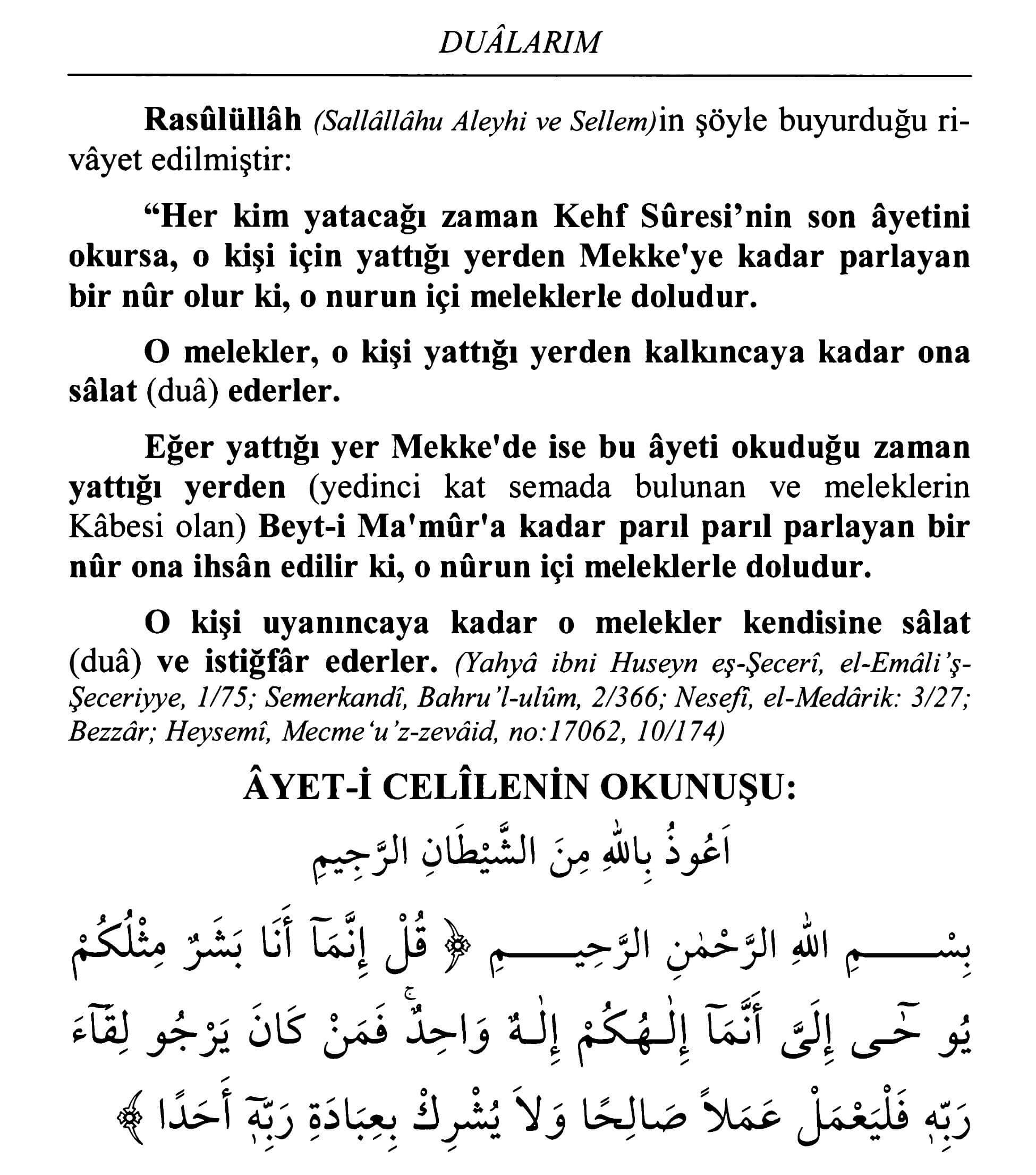 Yatacak Zaman Kehf Suresinin Son Ayetini Okumanın Fazileti2 Ocak 2024Uyumadan Önce OkunacaklarPaylaşPlayDualarımUykudan Uyanıştan İtibaren Yatıncaya Kadar Rasûlüllâh (Sallallâhu Aleyhi Ve Sellem)in Bir Gün Içinde Okuduğu Rivâyet Olunan, Dolayısıyla O'nun Ümmetinin Her Ferdinin Dualarım Diye Sahip Çıkarak Amel Etmesi Sünnet Olan Dua ve ZikirlerKitabı Satın AlDualarım, Sayfa 250 Kehf Suresi Son Ayetinin Kıraati00:00 / 00:00
