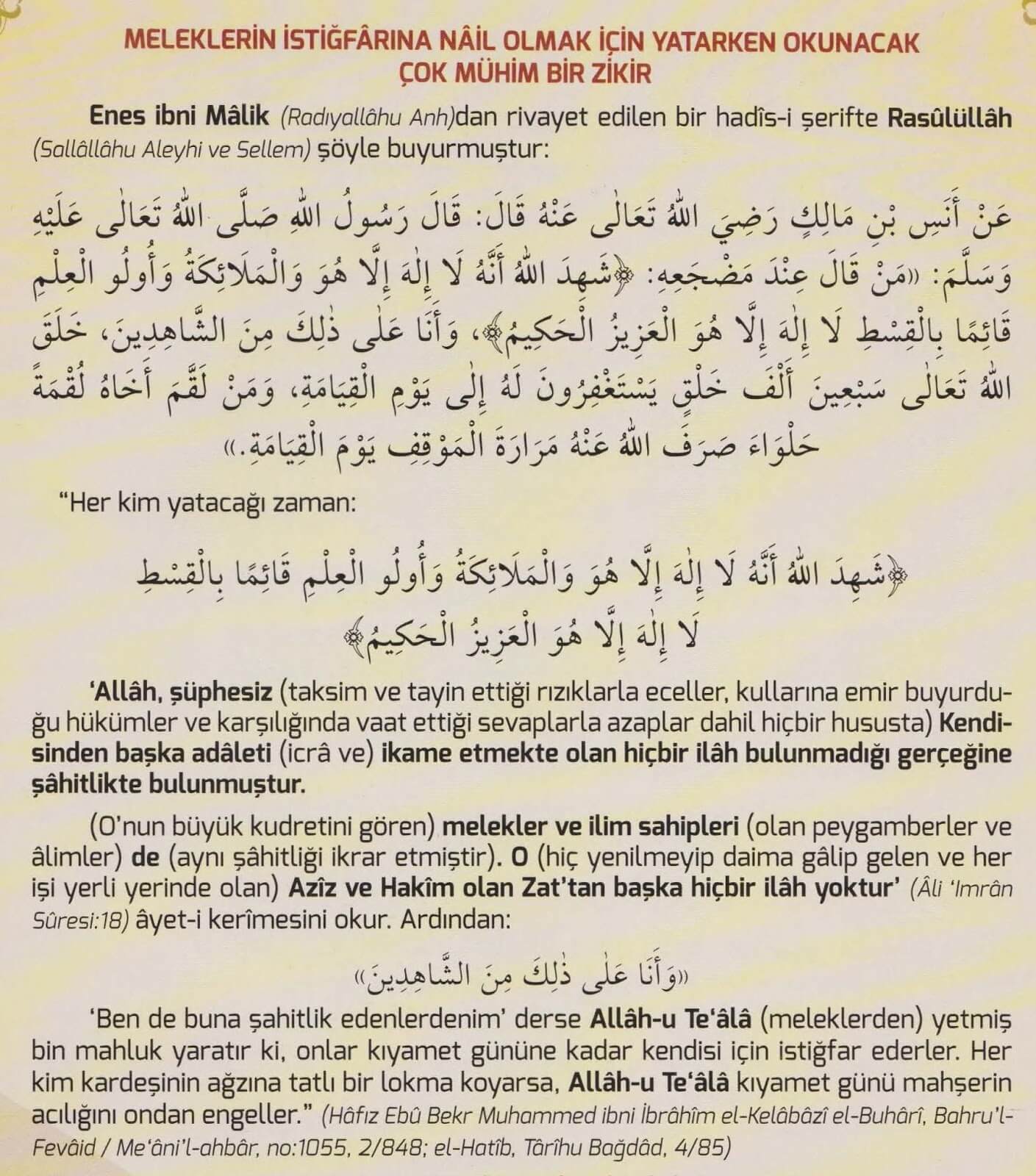 Yatacak Zaman Şehidallâhu Âyetini ve Duasını Okumanın Fazileti11 Temmuz 2023Uyumadan Önce OkunacaklarPaylaşPlayLalegül Dergisi Şubat 2014, Sayfa 89