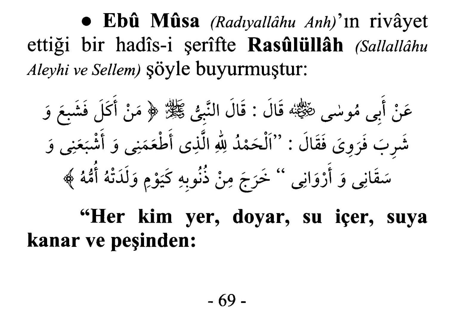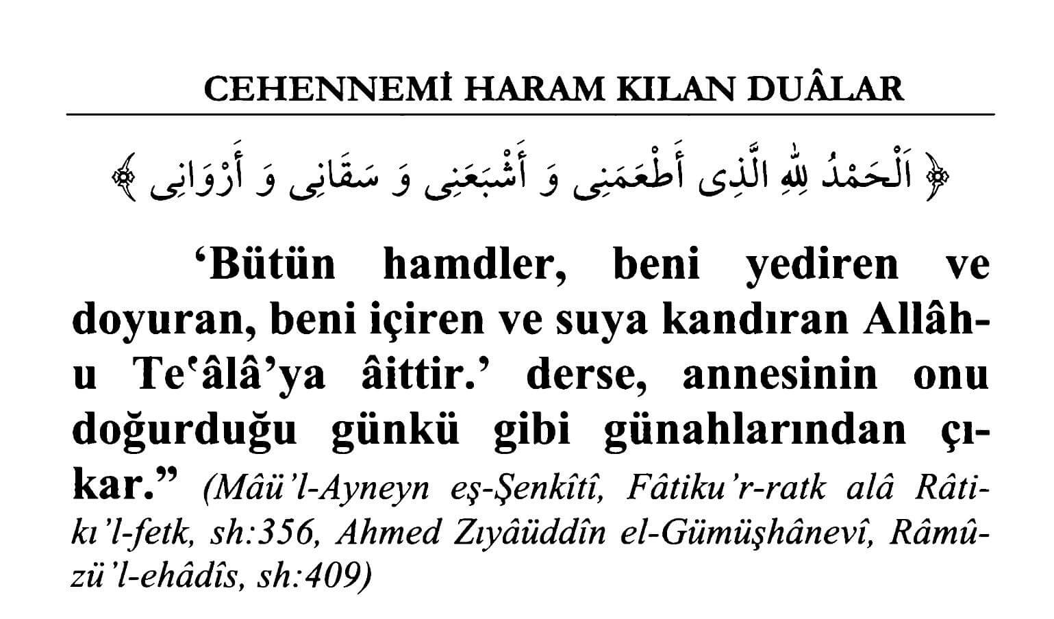 Günahları Bağışlatan Kısa Bir Yemek Duası21 Ocak 2024Yemek DualarıPaylaşPlayHer Bir Uzuv İçin Şifâ ÂyetleriHer Bir Uzuv (Organ) İçin Okunması Münâsip Olan Şifâ ÂyetleriKitabı Satın AlHer Bir Uzuv İçin Şifâ Âyetleri, Sayfa 69 Her Bir Uzuv İçin Şifâ Âyetleri, Sayfa 70 Okunuşu Elhamdülillâhillezî et-amenî ve eşbeanî ve seqânî ve ervânî.